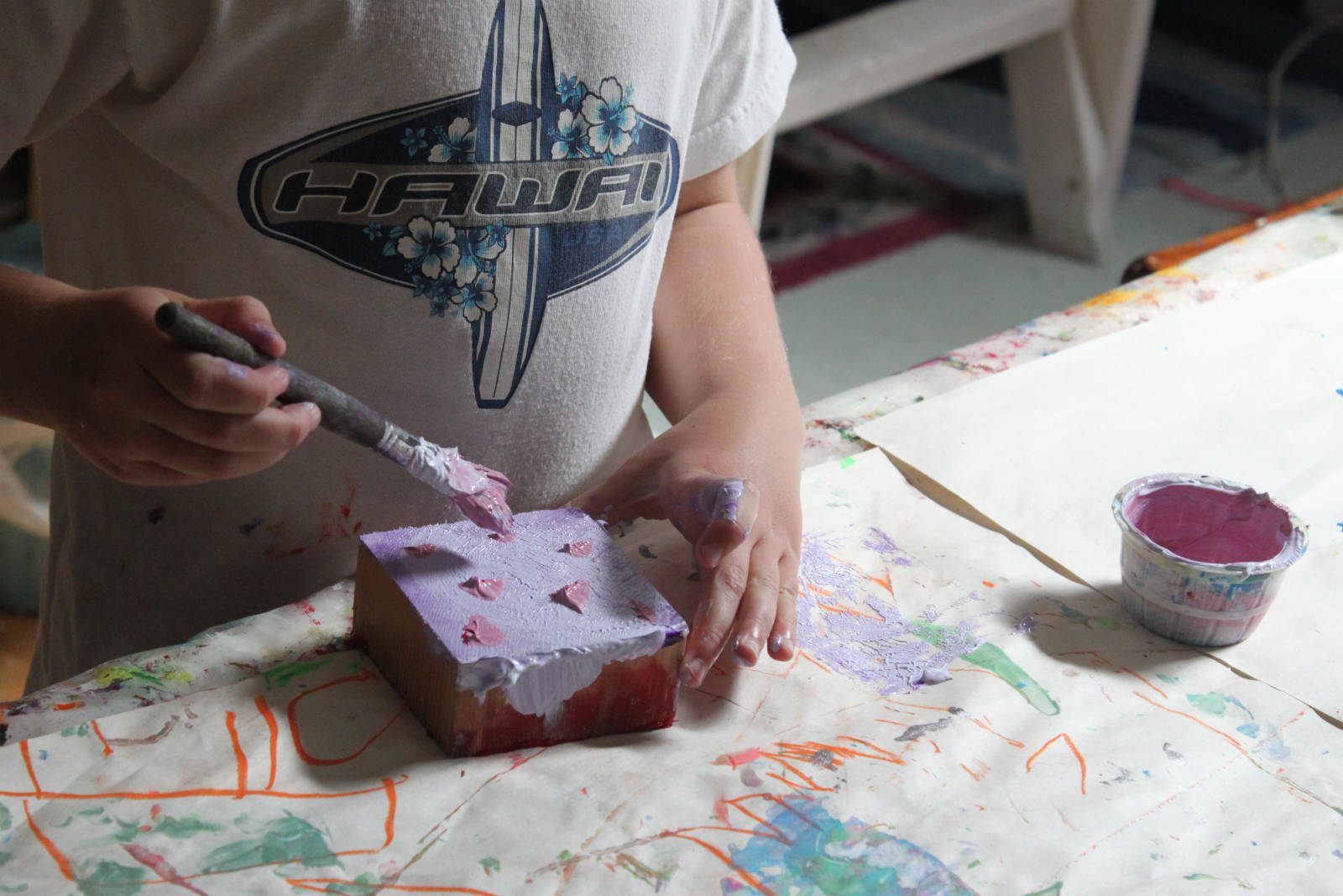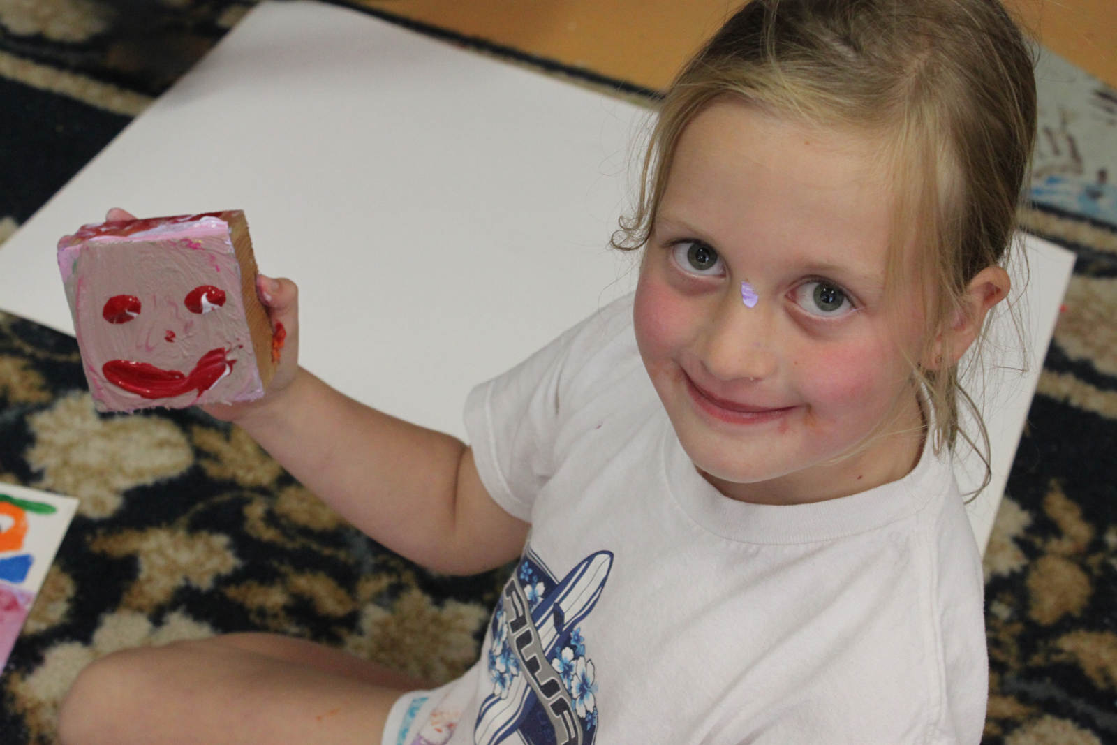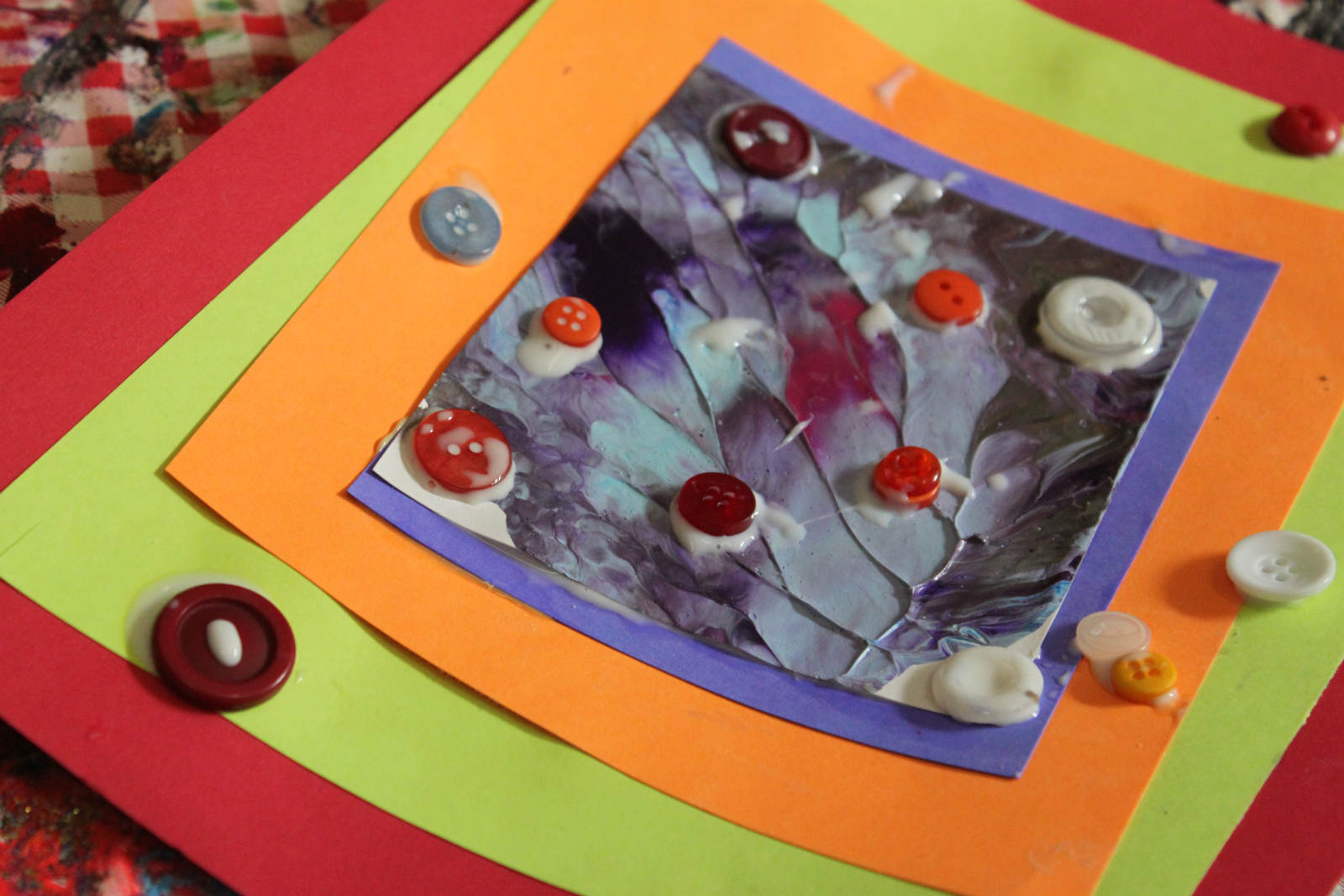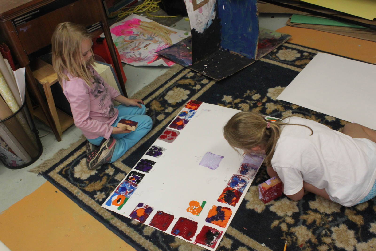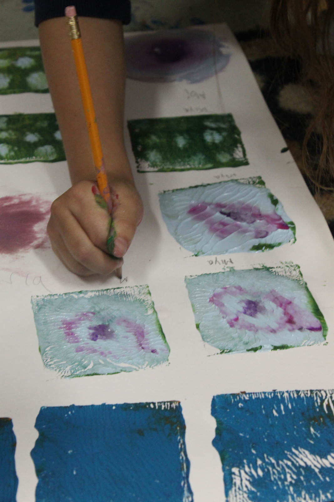 Maybe not officially real “block printing”, but we made prints. With blocks. And so it was named. This was a surprisingly quite process, I was expecting the same level of the usual silly girl chatter and playful experimentation leading to good creative chaos. But it was quiet, productive and orderly. The slippery blocks were gooped with paint, colours were mixed and the prints came out, one after another. The girls even began to twist their bocks, creating circular swirly prints. They tried multiple prints, prints on top of prints, and spent the entire class absorbed in the process. The girls noticed texture, blending, smooshing, and oozing of the paint as they worked.