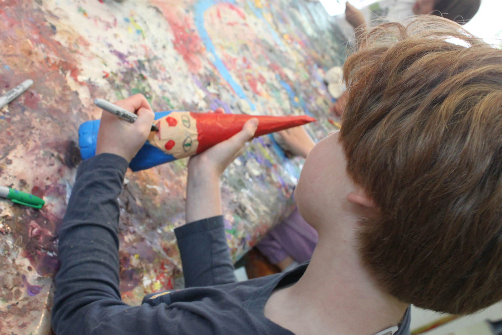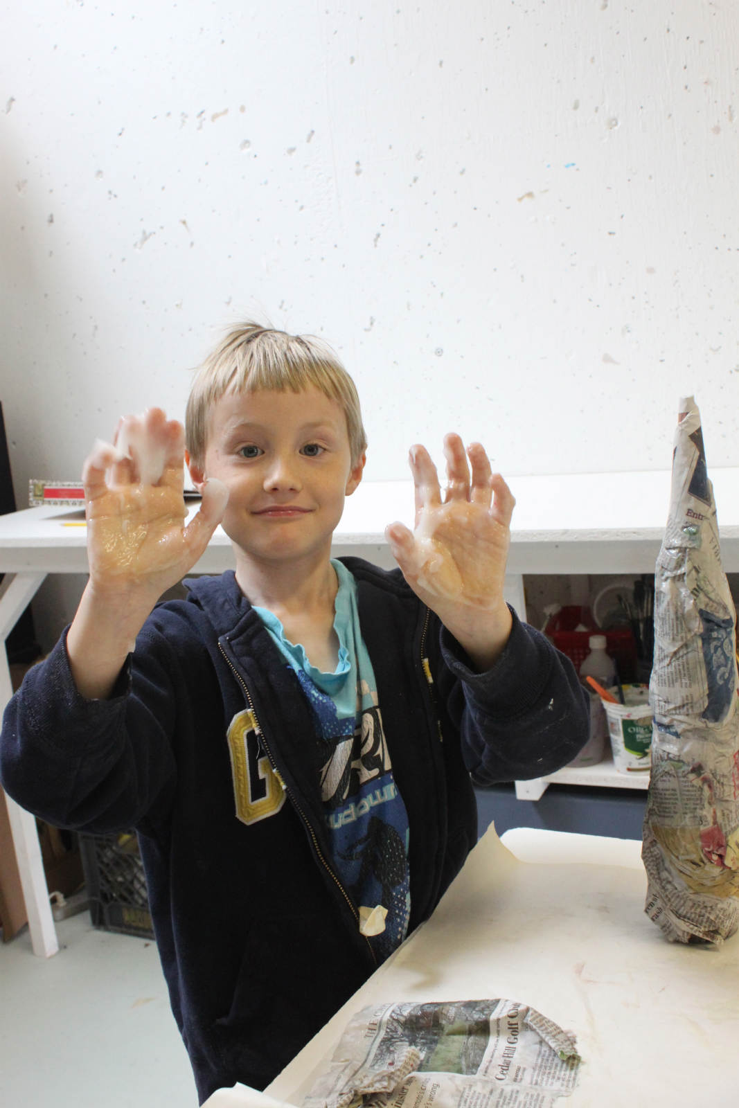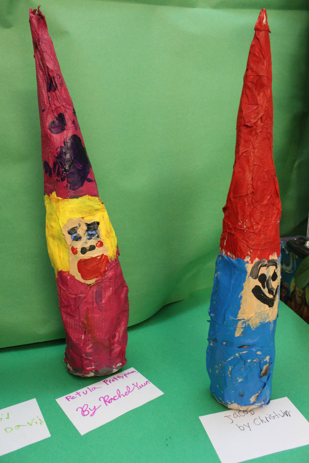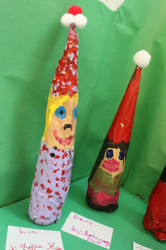Well, camp isn’t camp without getting mucky with the goop! We made these gnomes out of recycled water bottles and newspaper. Paper mache, yahoo! Check out this crazy cast of characters!
