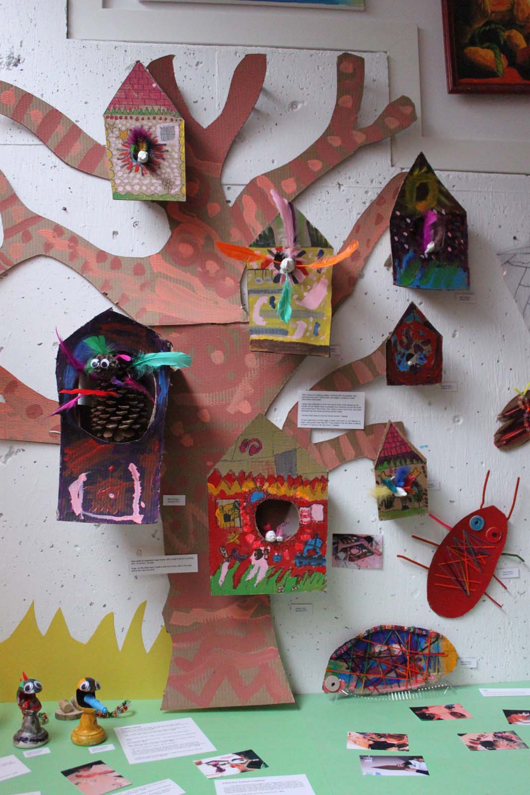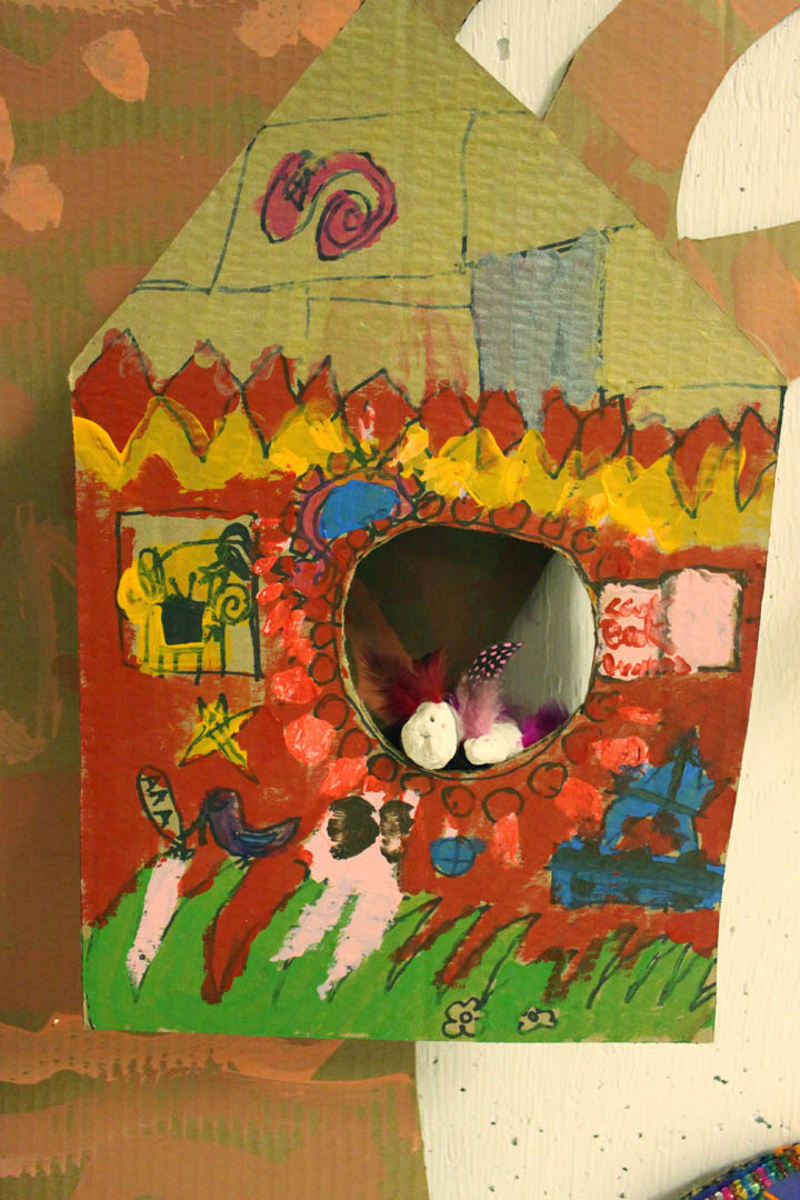 Lainey was delighted to think only about birds while designing her house. All her details were purposeful and centered around the birds who would live in the house. She made a worm cook book, “All they think about is worms worms worms.” and windows into the house showing scenes inside, “Every night they put their eggs in beds, tuck them in, put diapers on them, and guess what they do? They pretend that the baby is talking to them! It’s going to be very funny.”