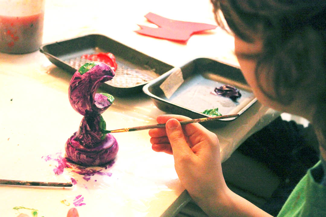 “All right I think I’m ready for some red paint! Can I borrow some paint, I m just going to paint his gums in now. Look at mine! Yum. Yum. Yum. Yum. I’m putting a bone in his mouth. It’s red because he ate something. There’s blood all over it. He ate his victim.” H
