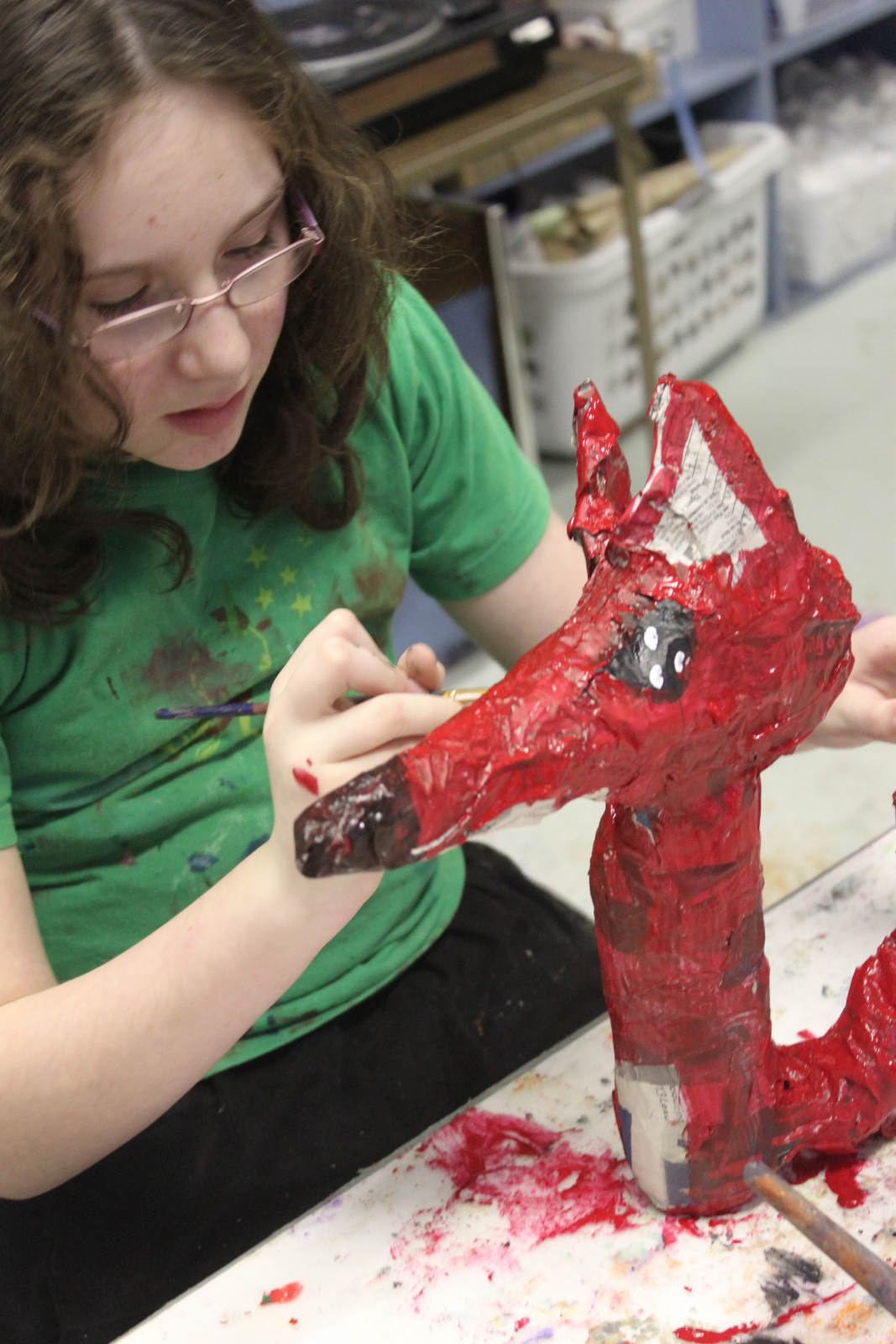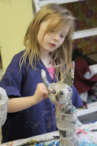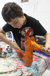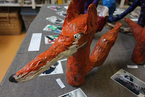 Finn discovered that covering his fox with paper mache was kind of like doing a puzzle -finding small pieces for tight areas, and bigger pieces for larger areas.