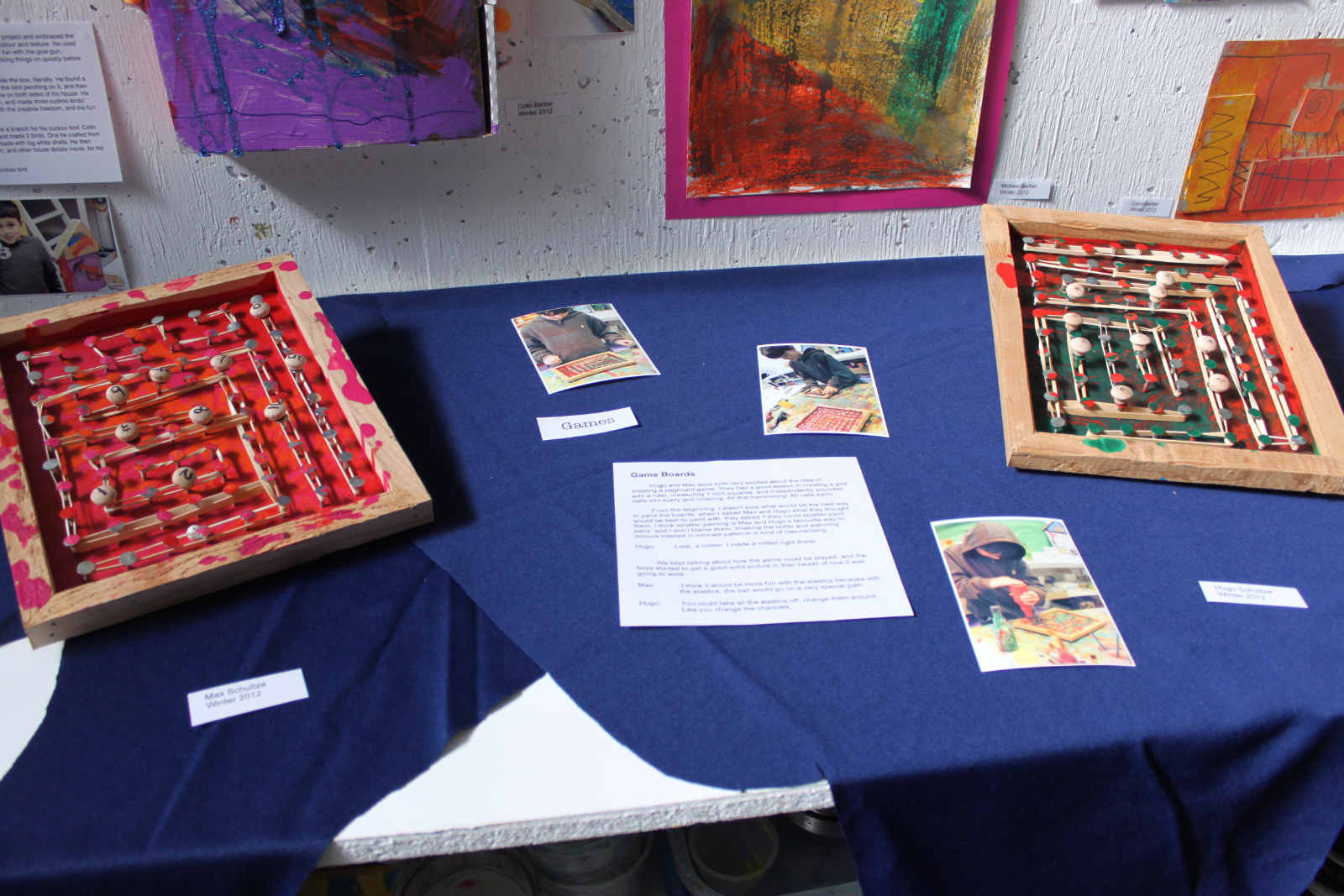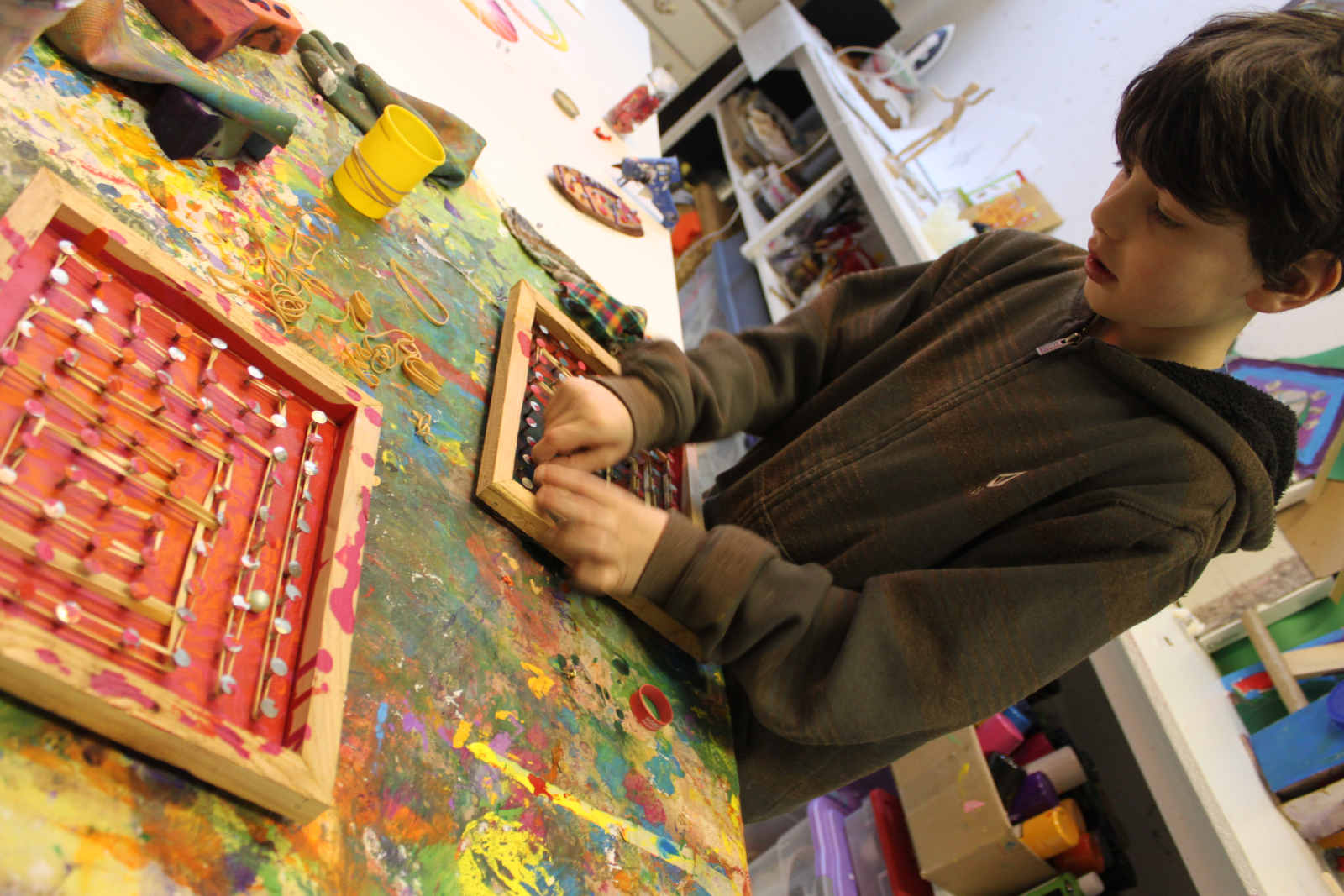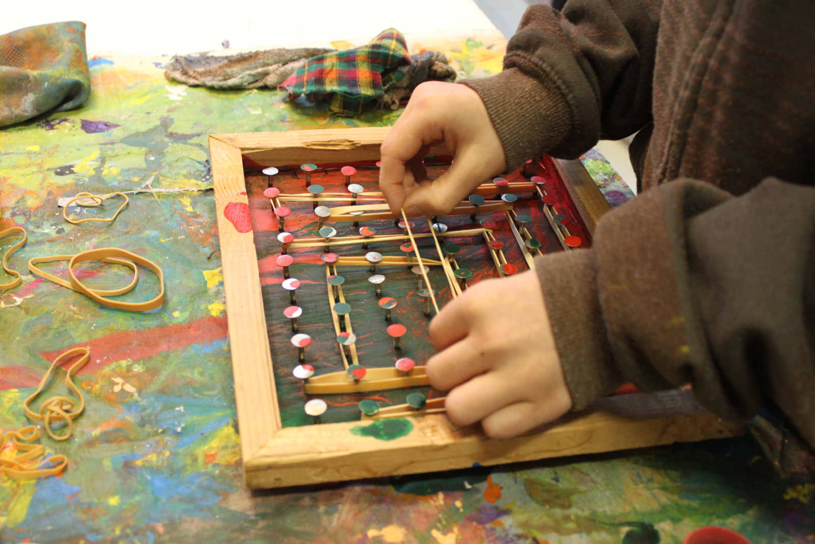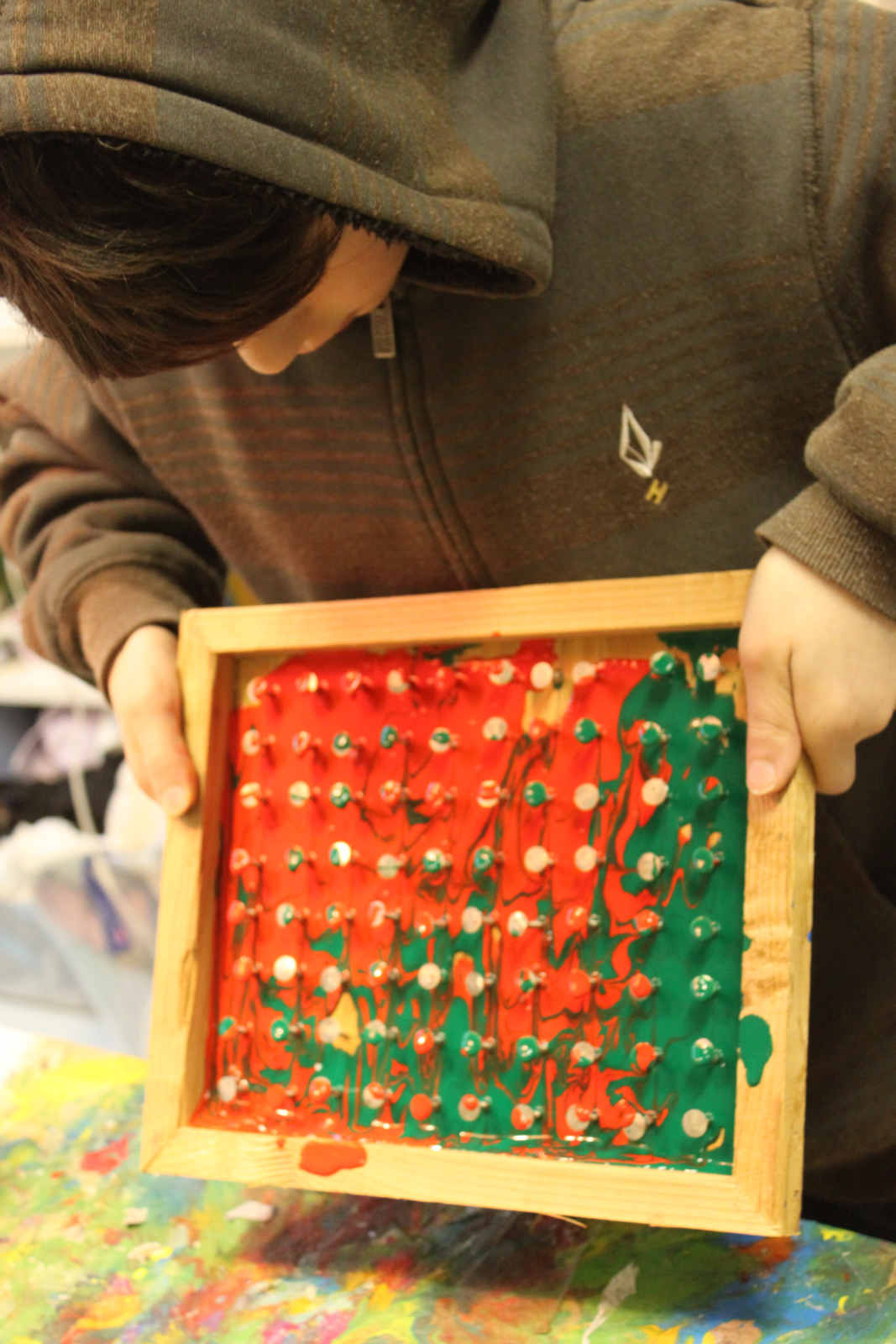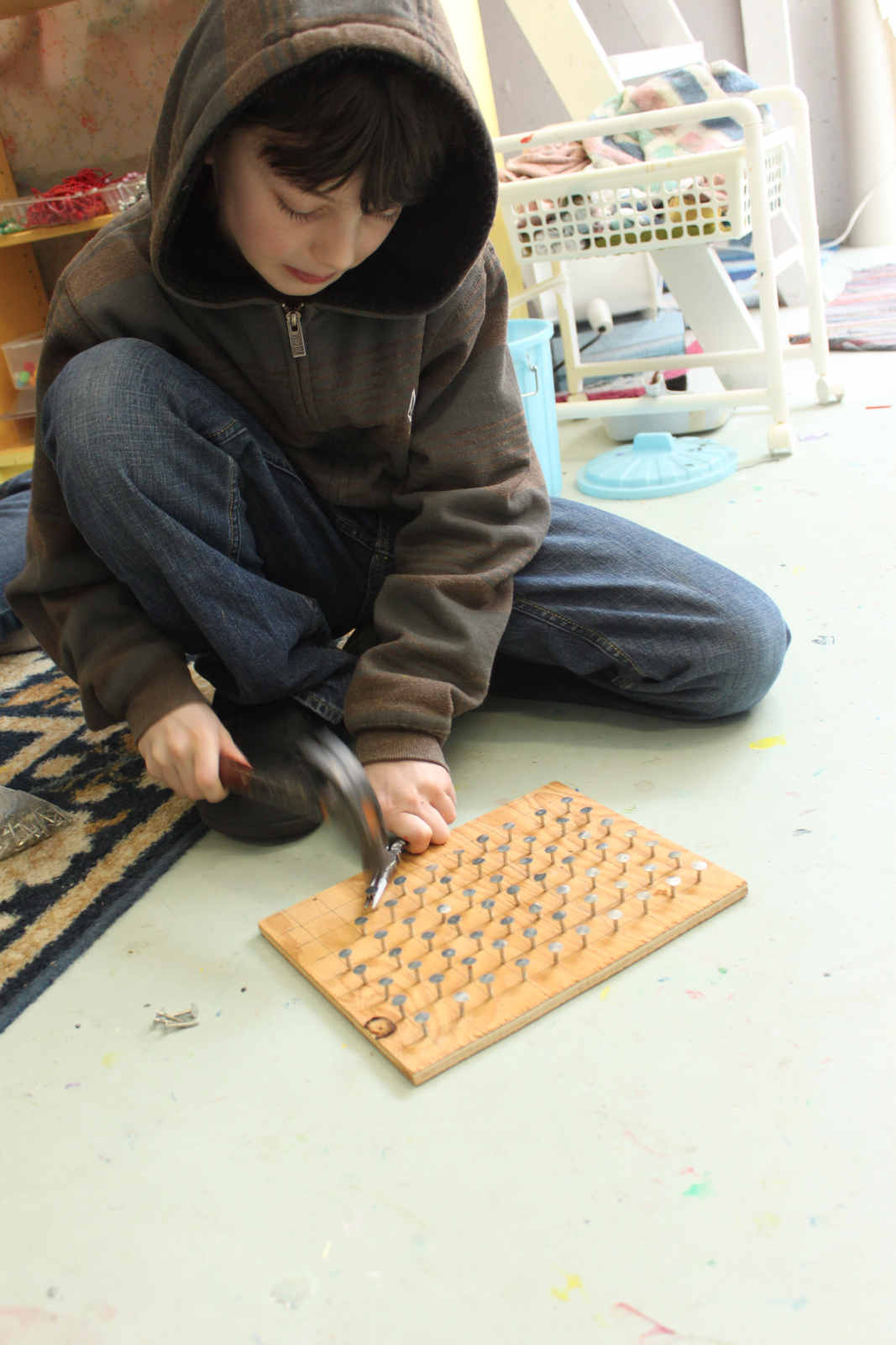 H and M were both very excited about the idea of creating a pegboard game. They had a good lesson in creating a grid with a ruler, measuring 1 inch squares, and independently pounded nails into every grid crossing. All that hammering! 80 nails each!