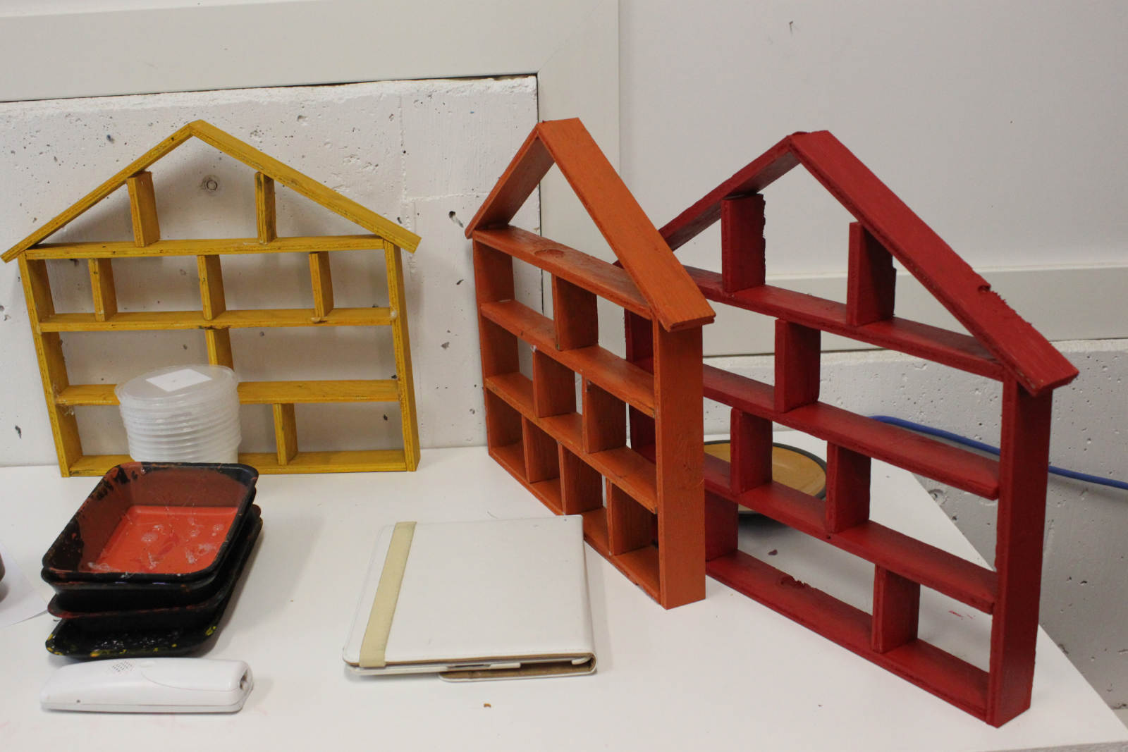 What a very nice place to keep some knickknacks. Four of the campers decided to make these shelves, and many coats of paint and gloss were used to make the wood shine, and the patterned paper was thoughtfully chosen. I'd live there.