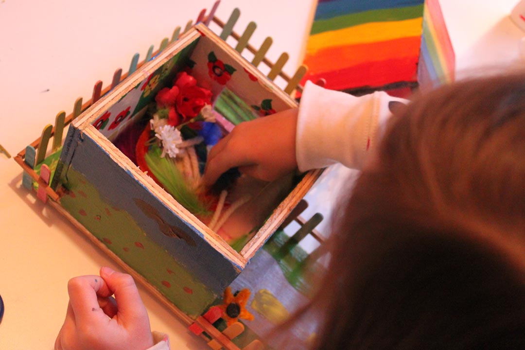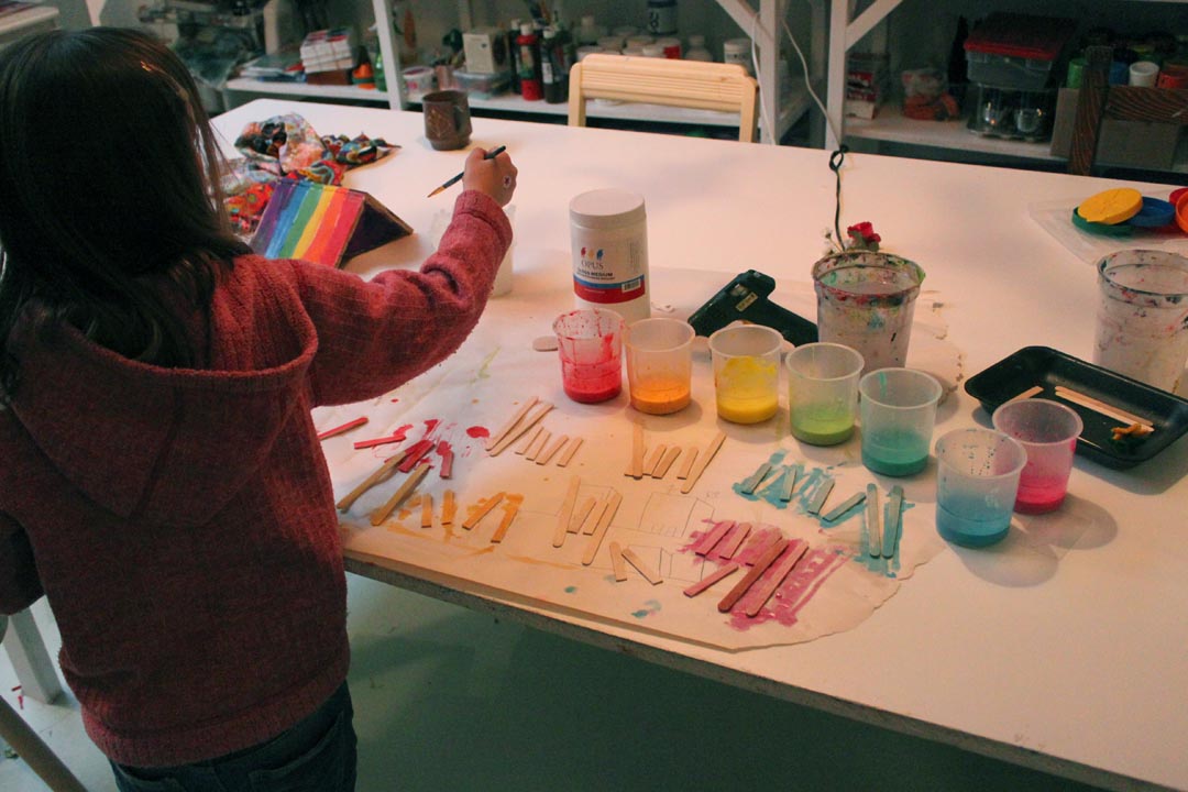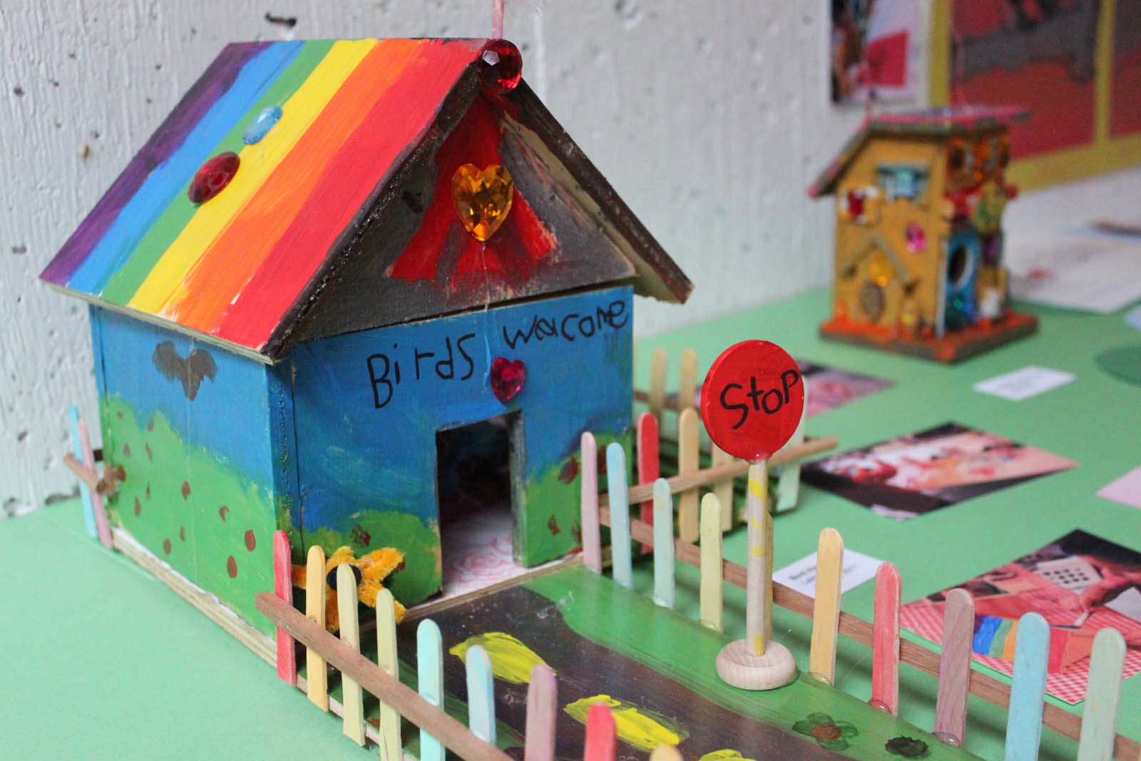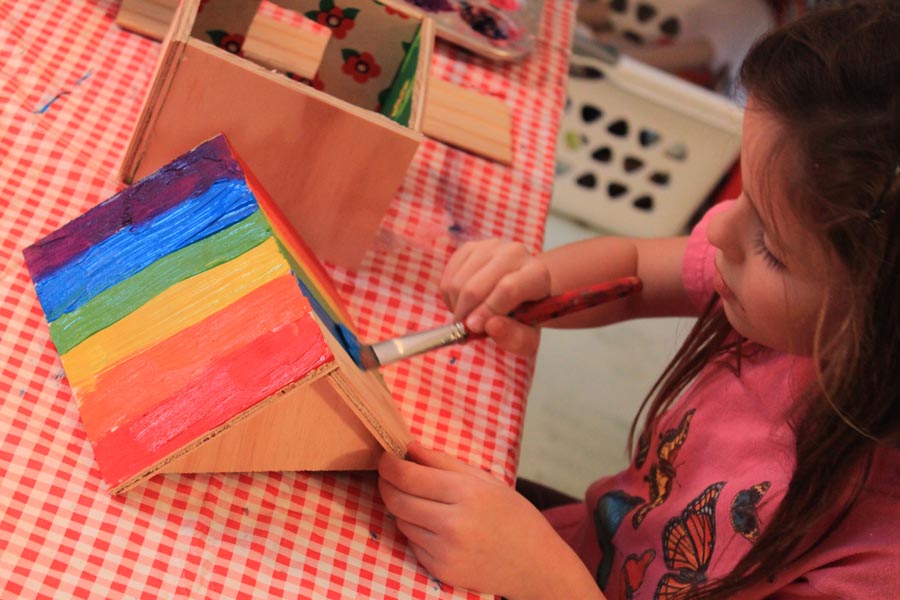 Having had so much fun making her cardboard house, Lainey didn’t want to give up on her birdhouse theme. She showed interest in making a real bird house, and even expressed a desire to create a whole bird kingdom! We used one of the little house kits that my dad had made for me. Lainey wallpapered the inside, we glued it all together, and then Lainey painted it in bright acrylics. Lainey predicted from the start that the birds will want to fight over the birdhouse. She painted a peace sign to prevent that from happening.