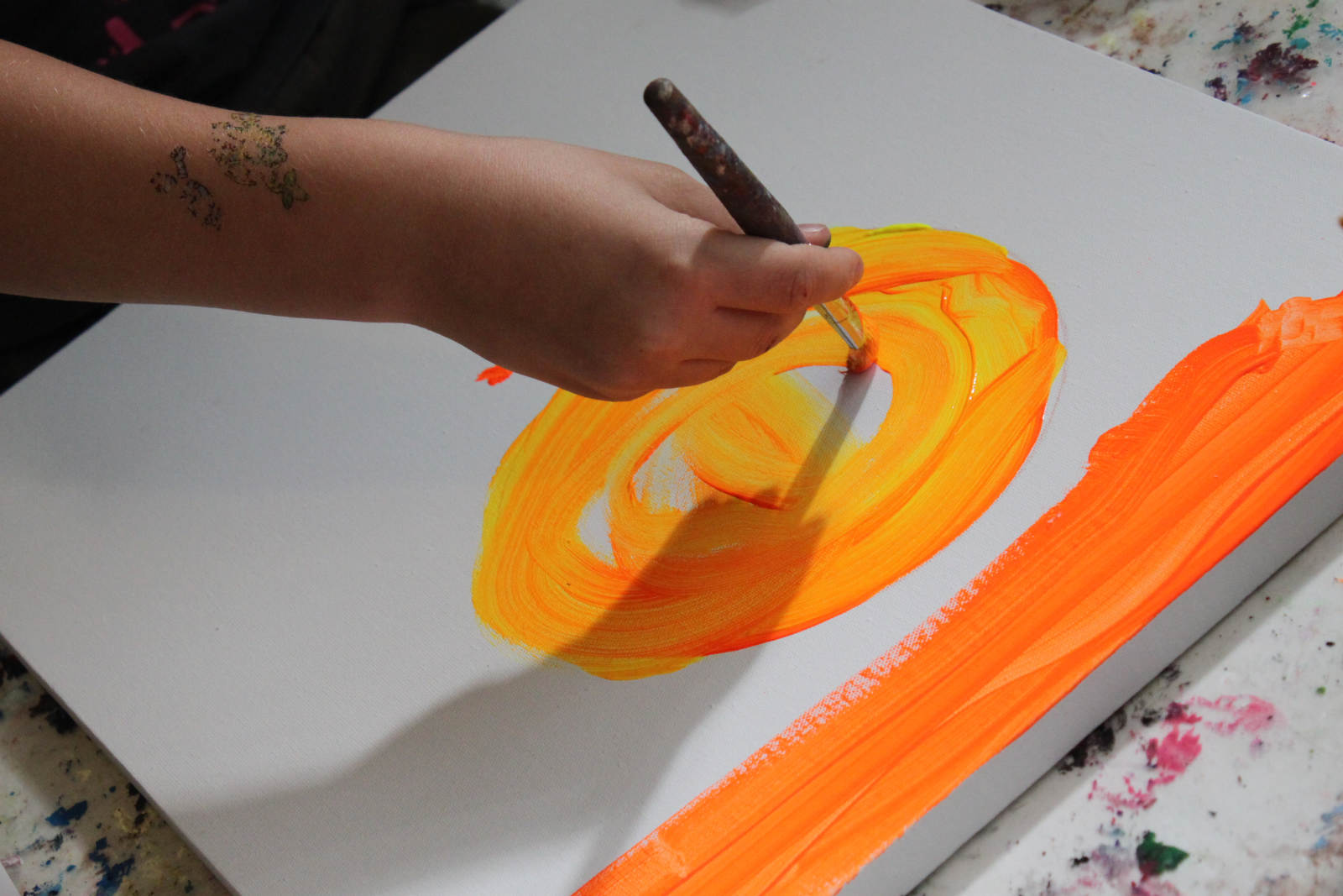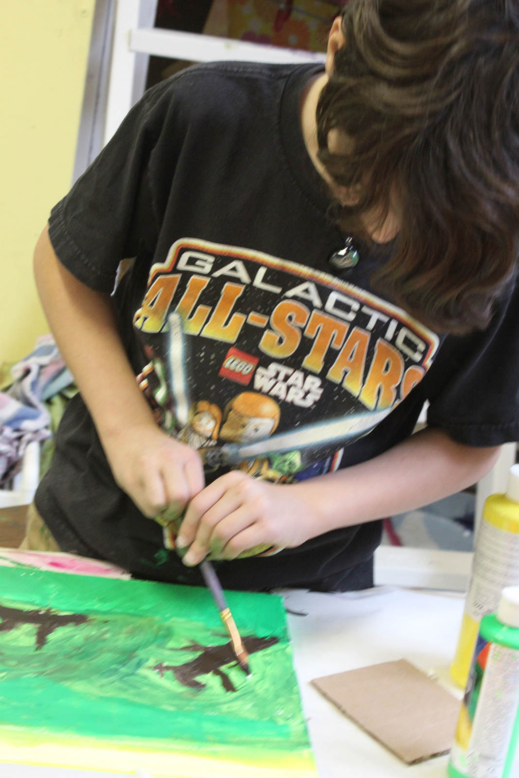 They revisited their paintings a few weeks later, and used palette knives to create different textures. M added a beautiful amount of depth with his second layer of paint. He played, explored, and experimented with blending using the knife.