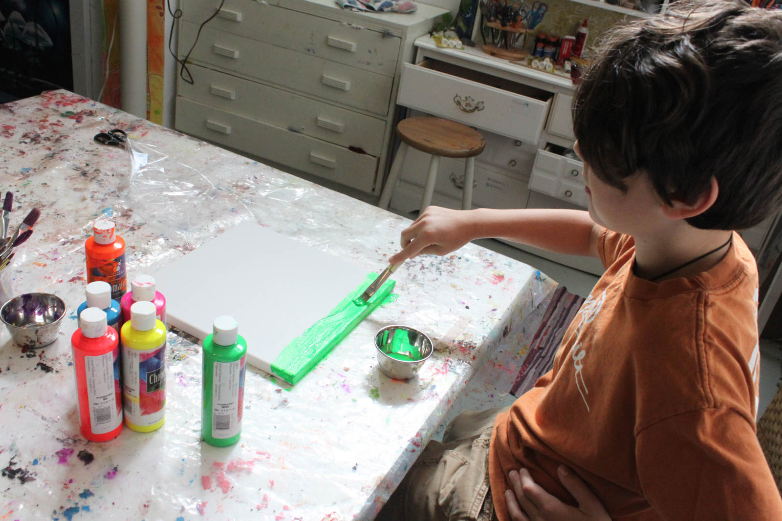 H also was getting his desired results with his painting. It was nice to see how far the boys have come in their ability to think of an idea and see it through with focus and determination. Their increasing understanding of paint, and everything that goes with it, is showing itself here in bright, bold fluorescent colours!