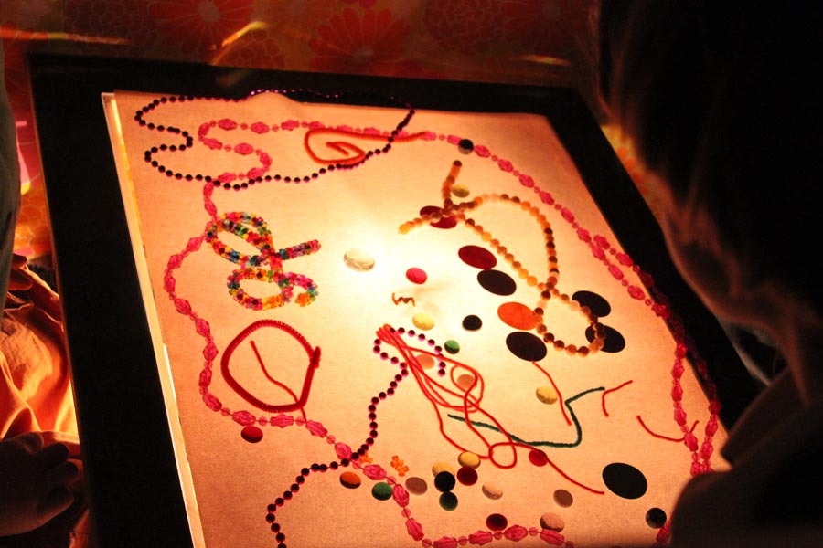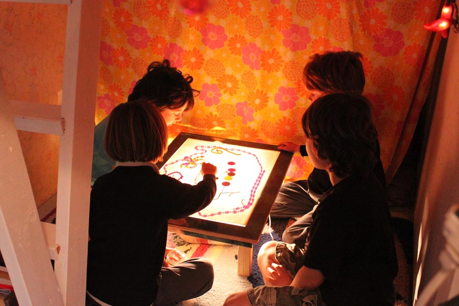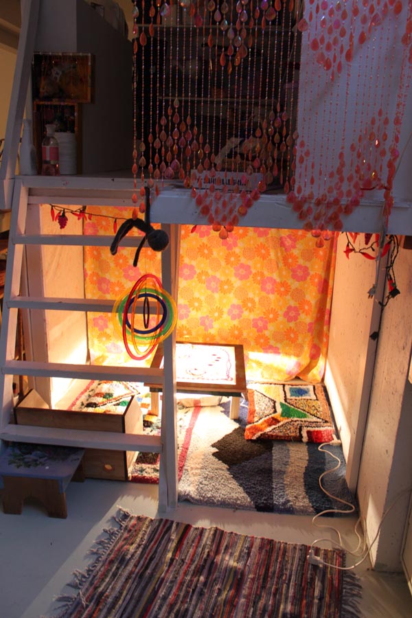 When I first started putting together my studio space, a friend had mentioned how cool it would be for me to create a special area under the ladder, a cozy little space for kids to go. It was a great idea, but the spot quickly became storage for old paintings, and a lampshade collection that I still don’t know what I am going to do with. Anyway, my dear old dad was building me a little light table, and I needed somewhere to put it so I layed down some soft rugs and the little spot became the perfect space for experimenting with light. Maggie liked the cozy spot too!