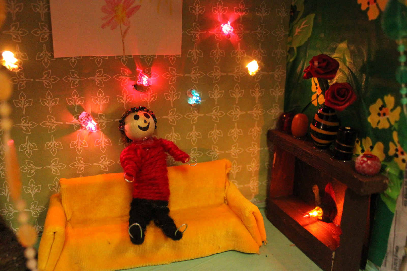 She put lots of thought into her dollhouse and thought of making a shelf in her playroom, a fire place, a fur covered chair, and a bright yellow sofa!