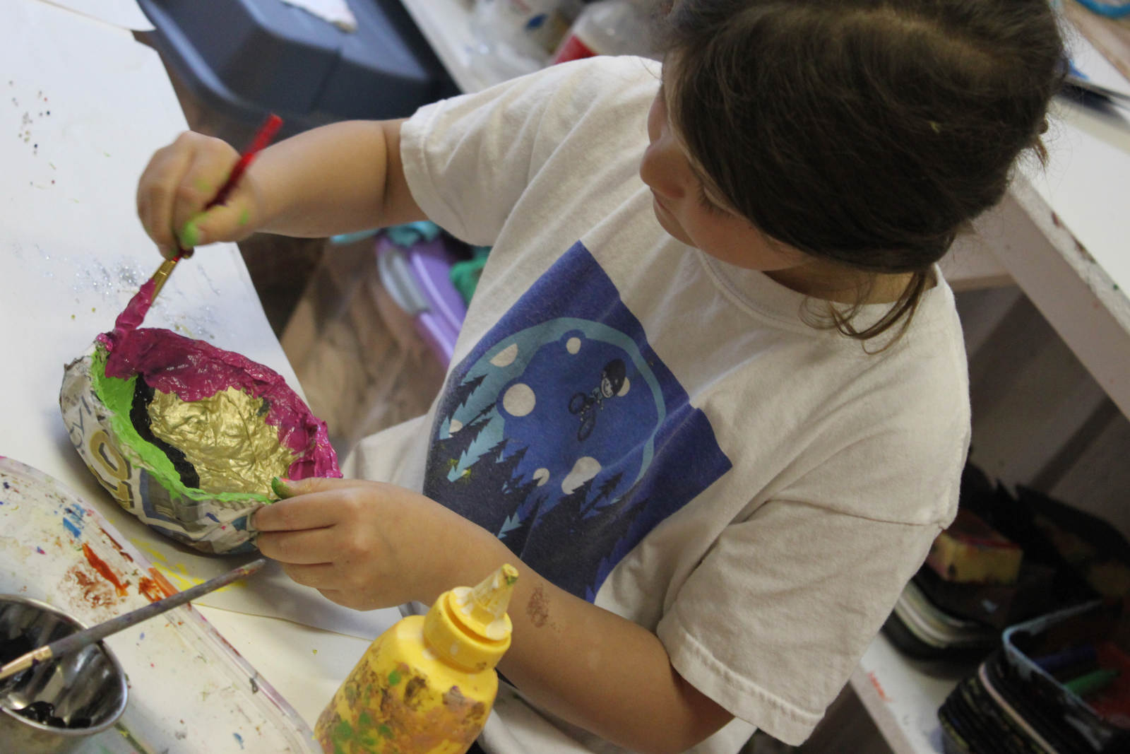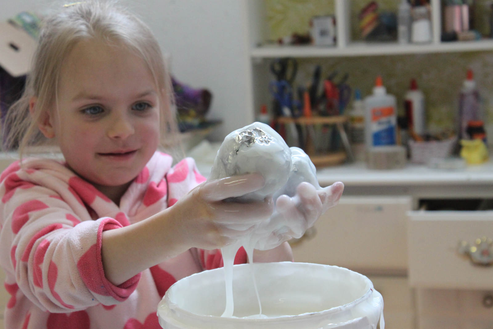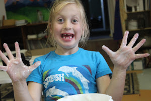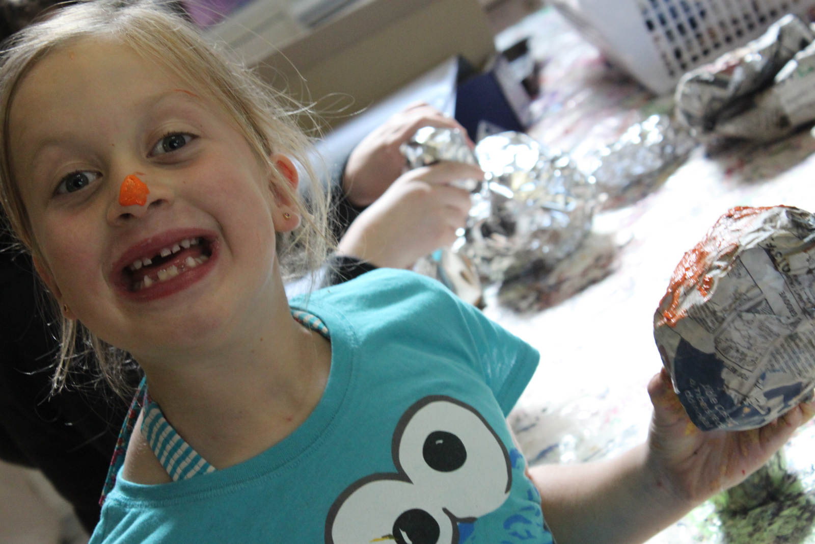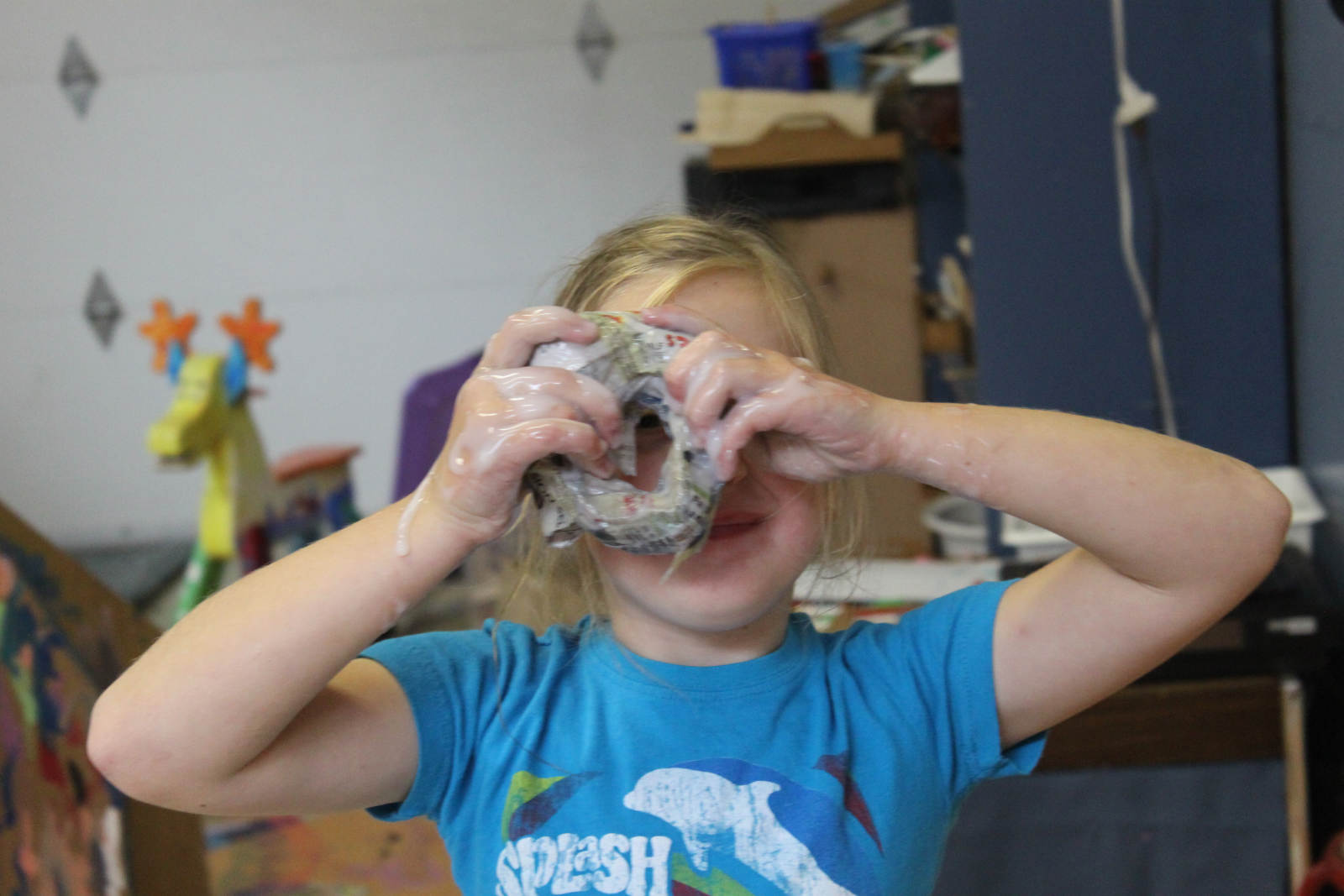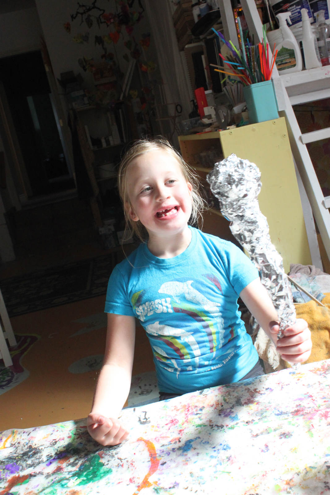 They love when the goop comes out. The slippery, slimy texture is pretty irresistible to a gaggle of goofy girls. They plunged their hands into the buckets of goop, and slathered it on their tinfoil forms and covered them in paper.