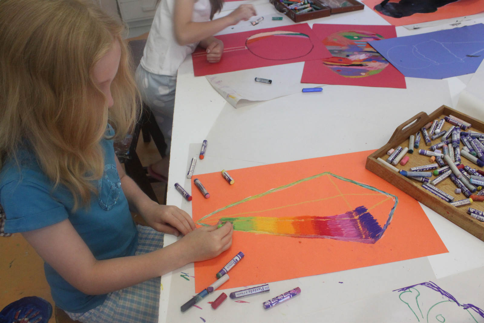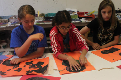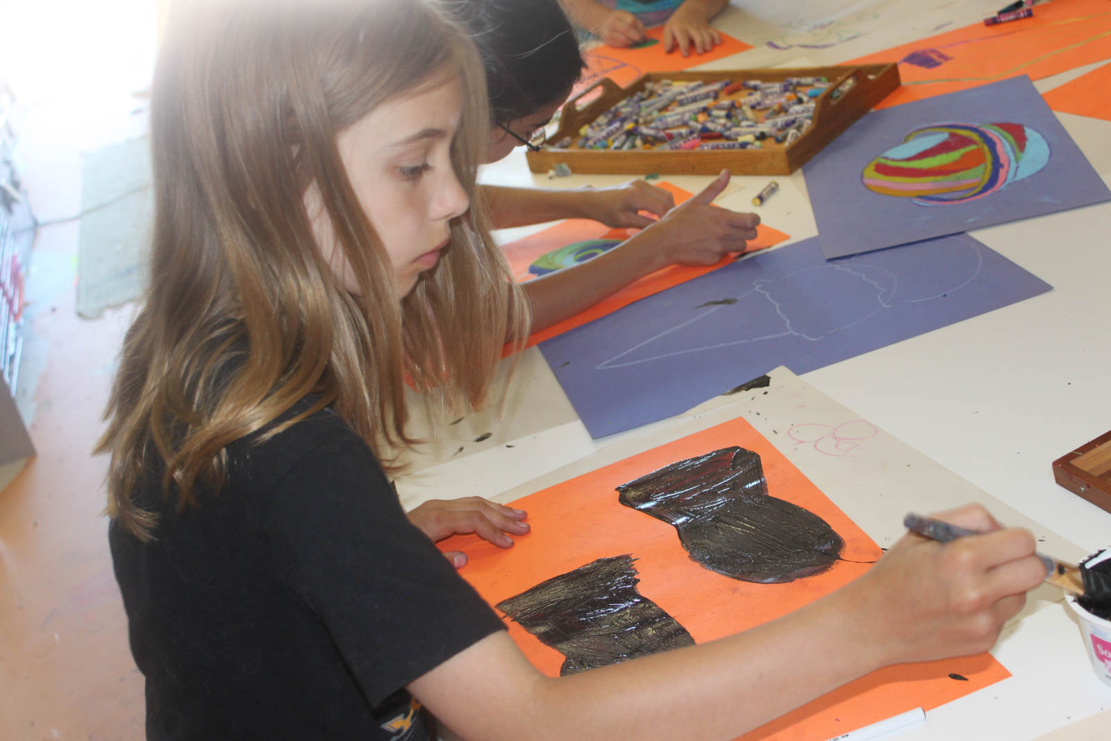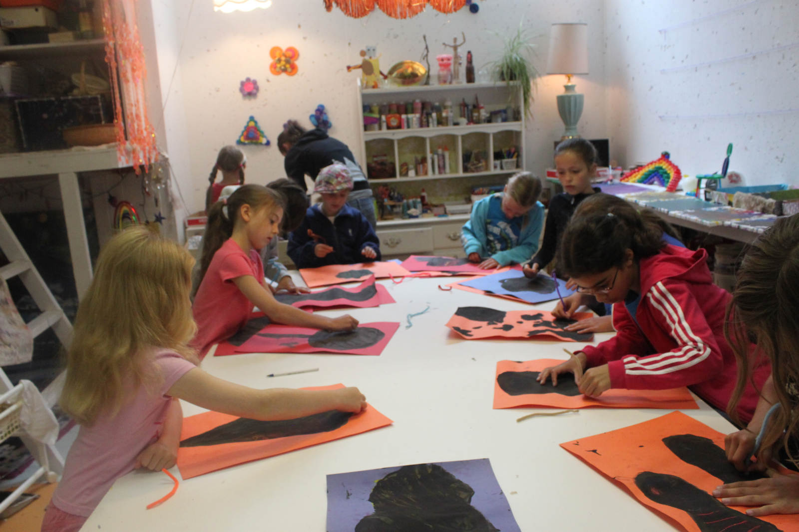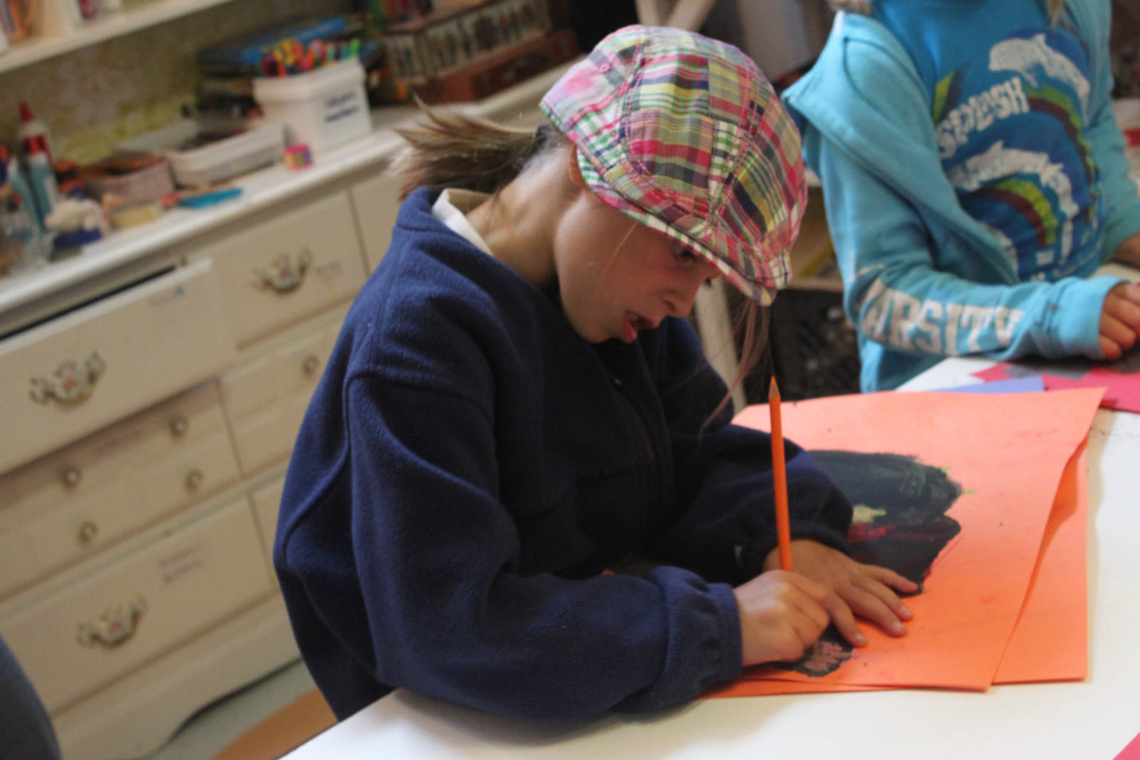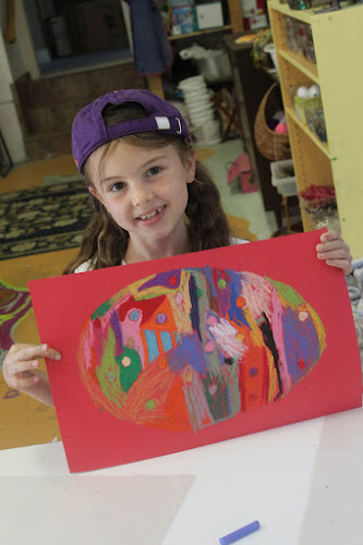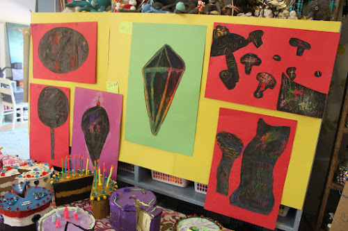 Starting with a colourful shape of oil pastel, we added a layer of black paint, and then scratched away to find the colours underneath. I have done this before with much more vibrant results, and I’m not sure what was different this time. The kids didn’t seem to mind though. Good sports, they are!