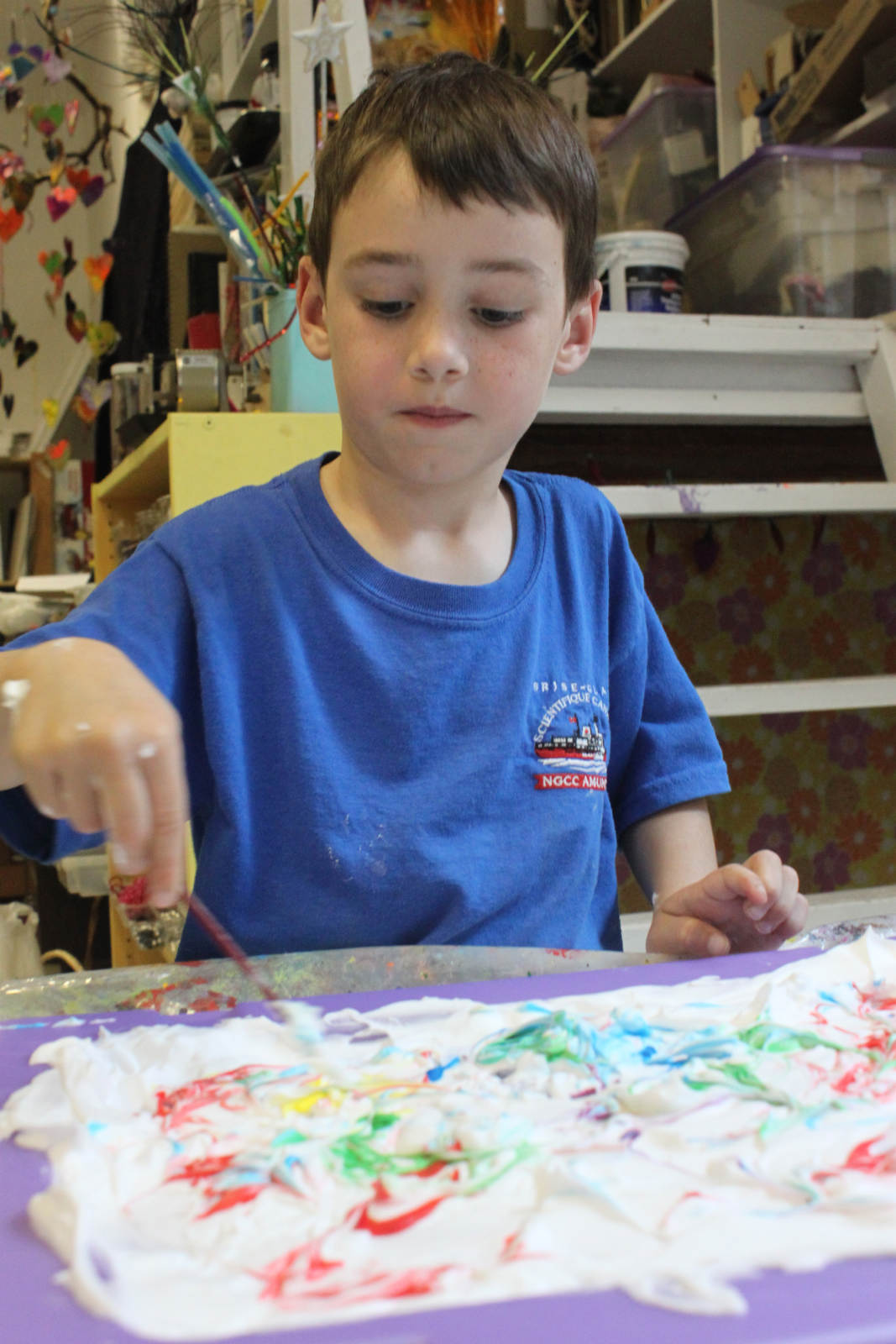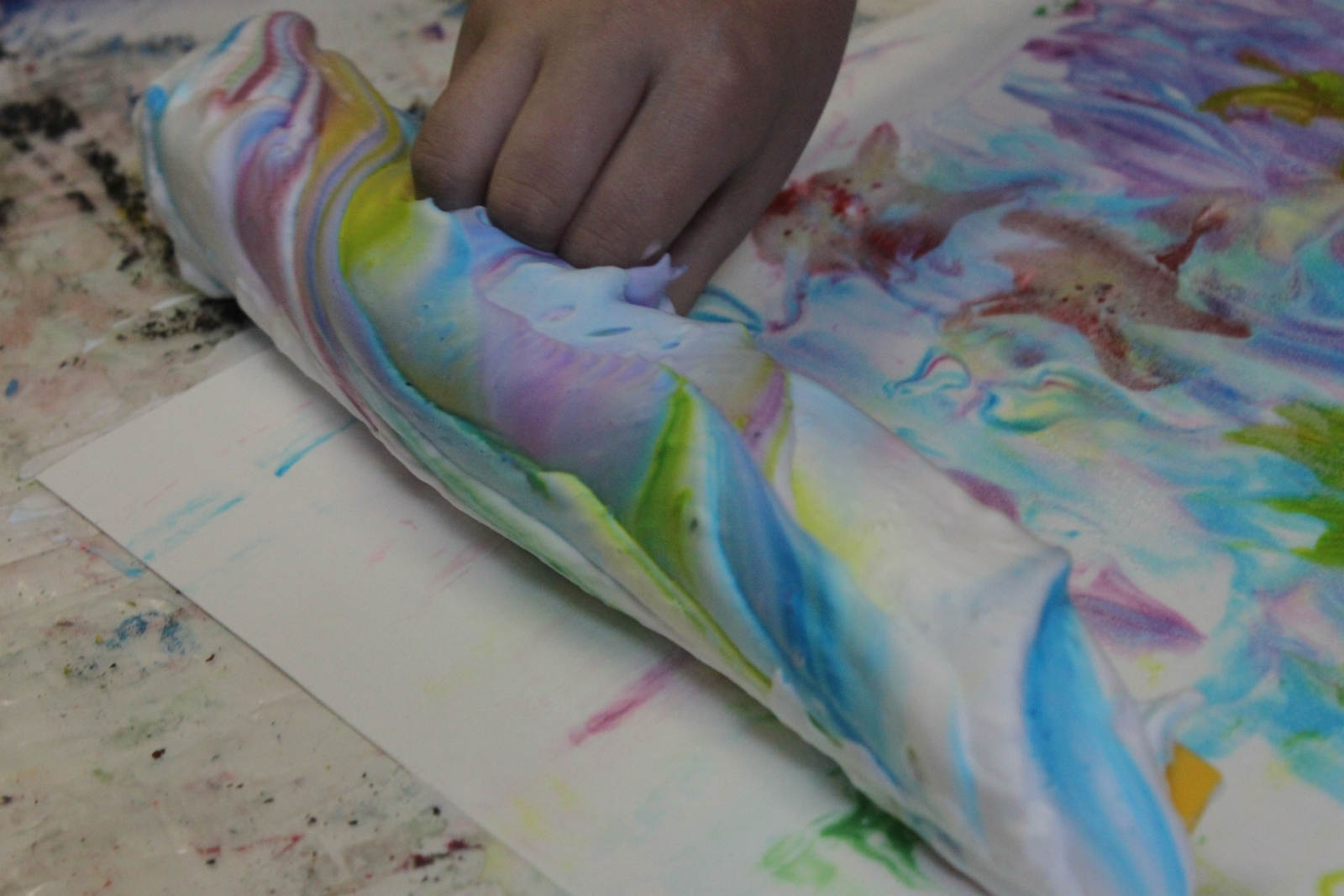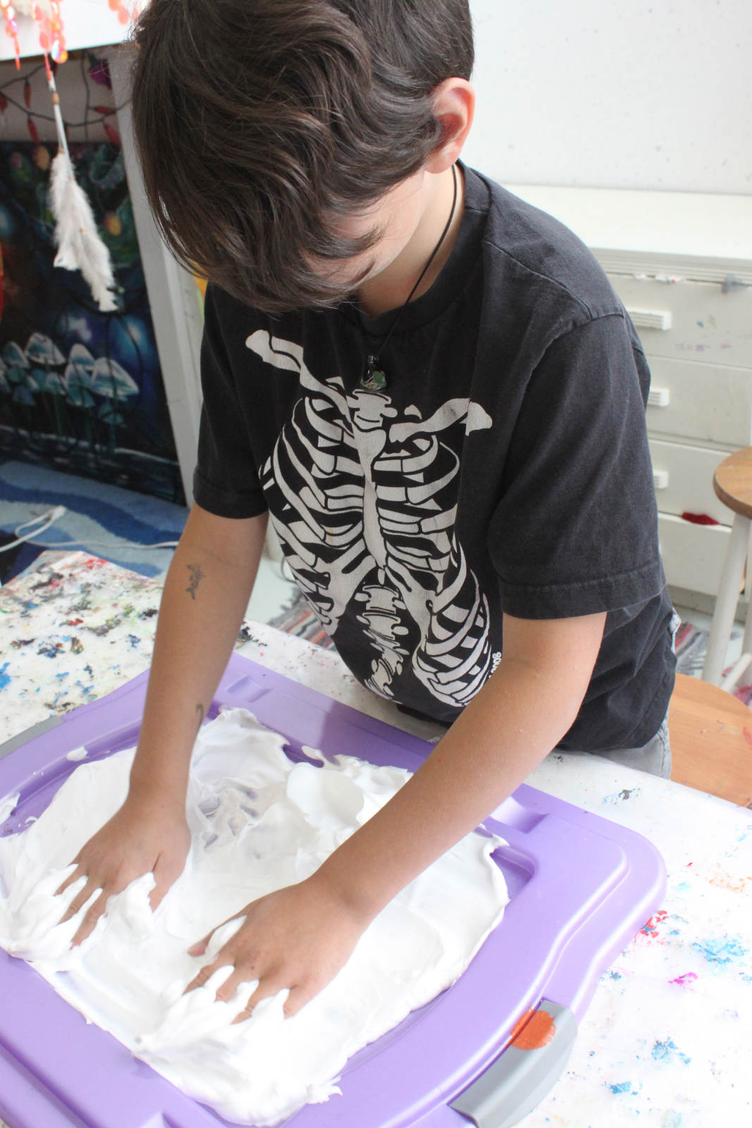 Finn began to see images and big themes within the patterns of the shaving cream prints right away. He reveled in the sensory experience of the soft and supple foamy cream on his hands.