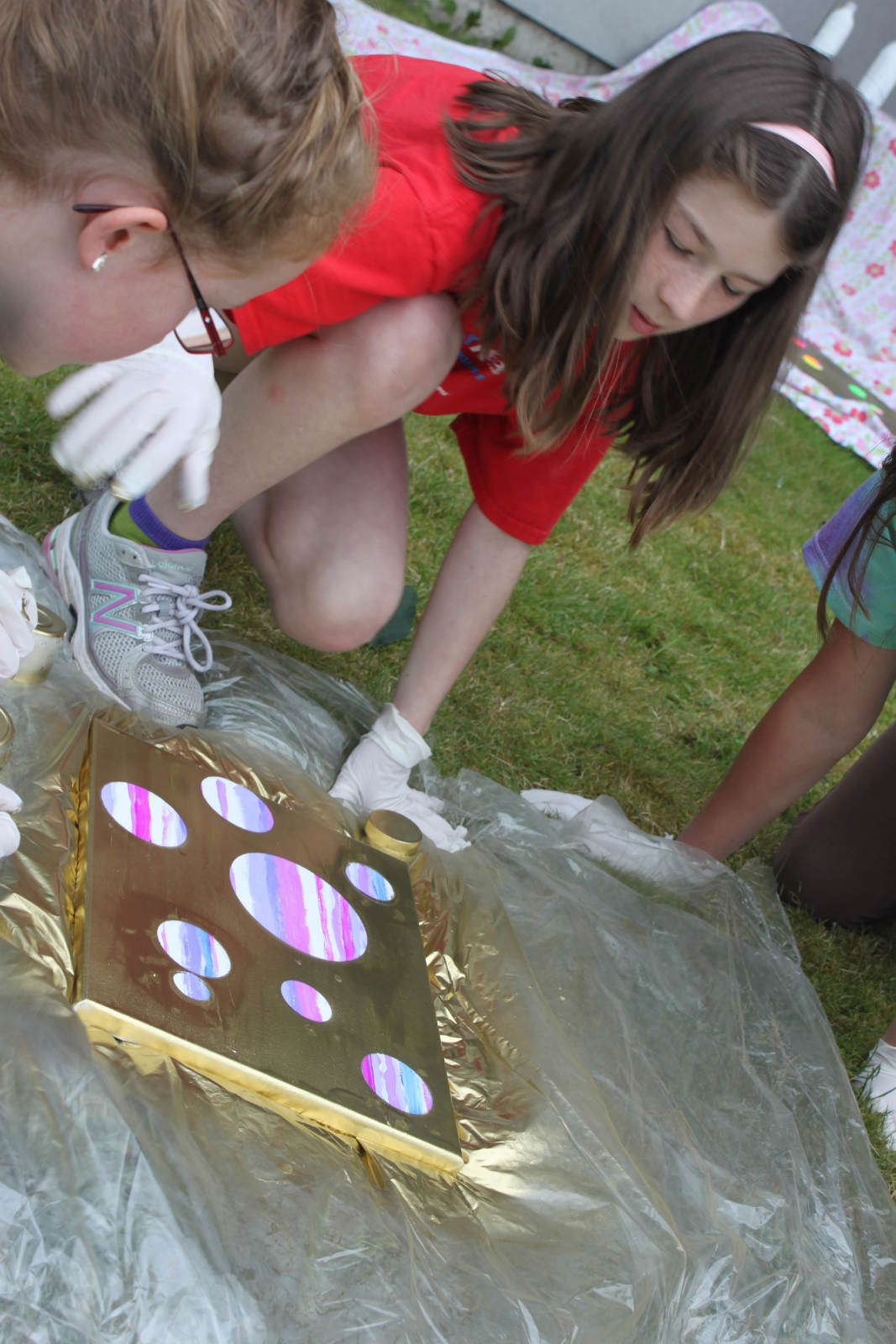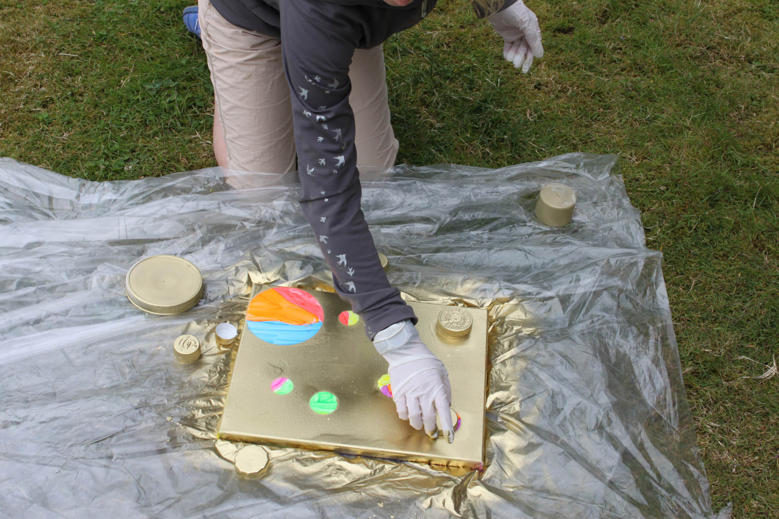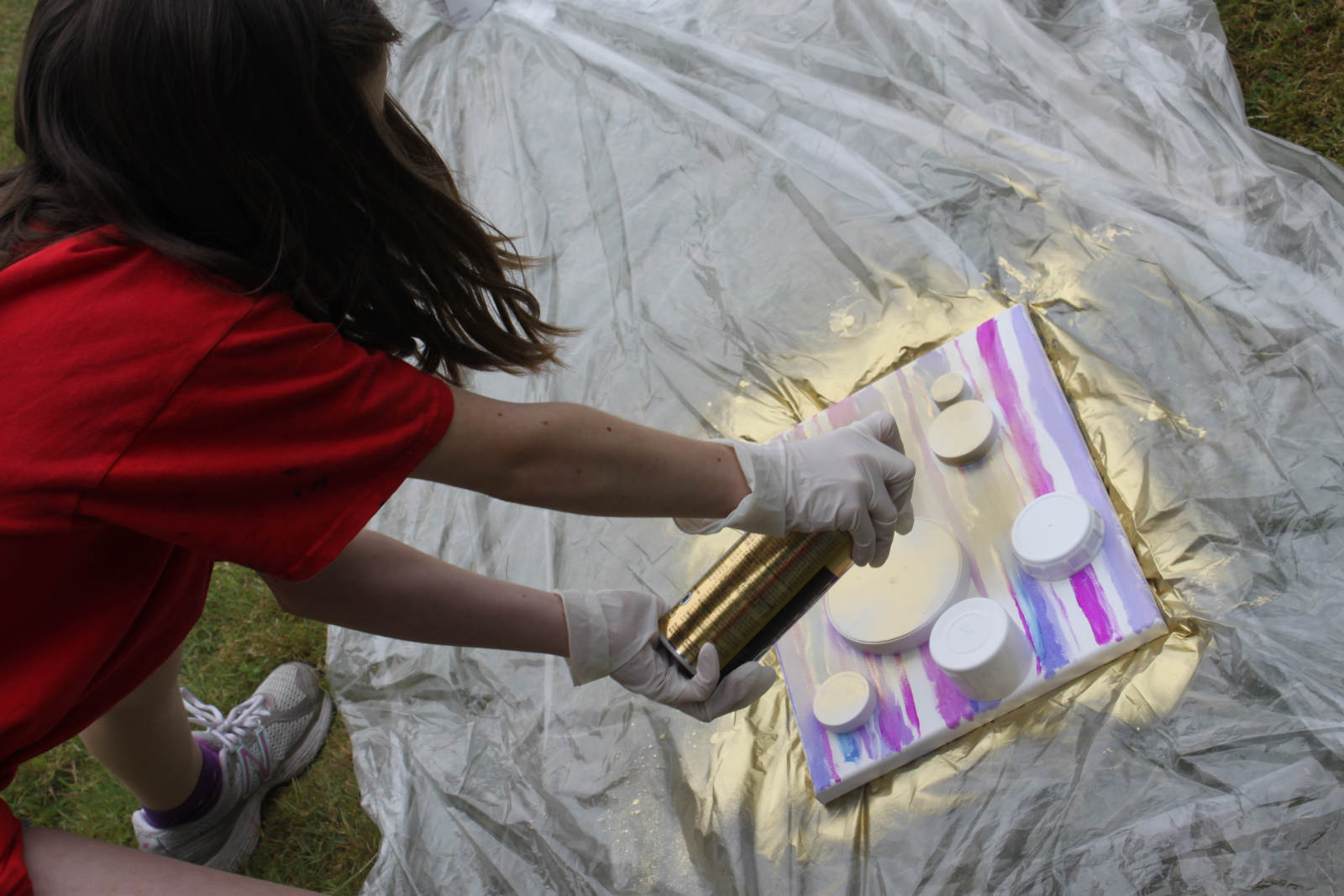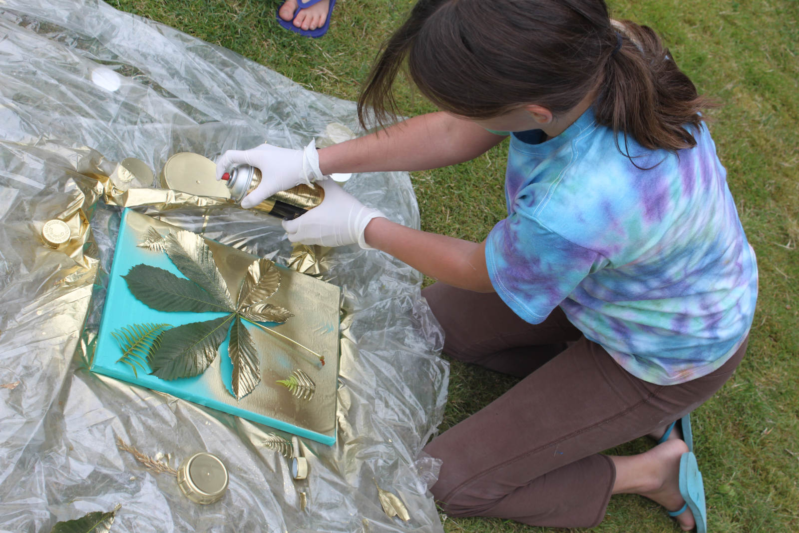 Gold spray paint! The girls found different things to use as stencils, some chose lids, some chose bits of nature. Gold!