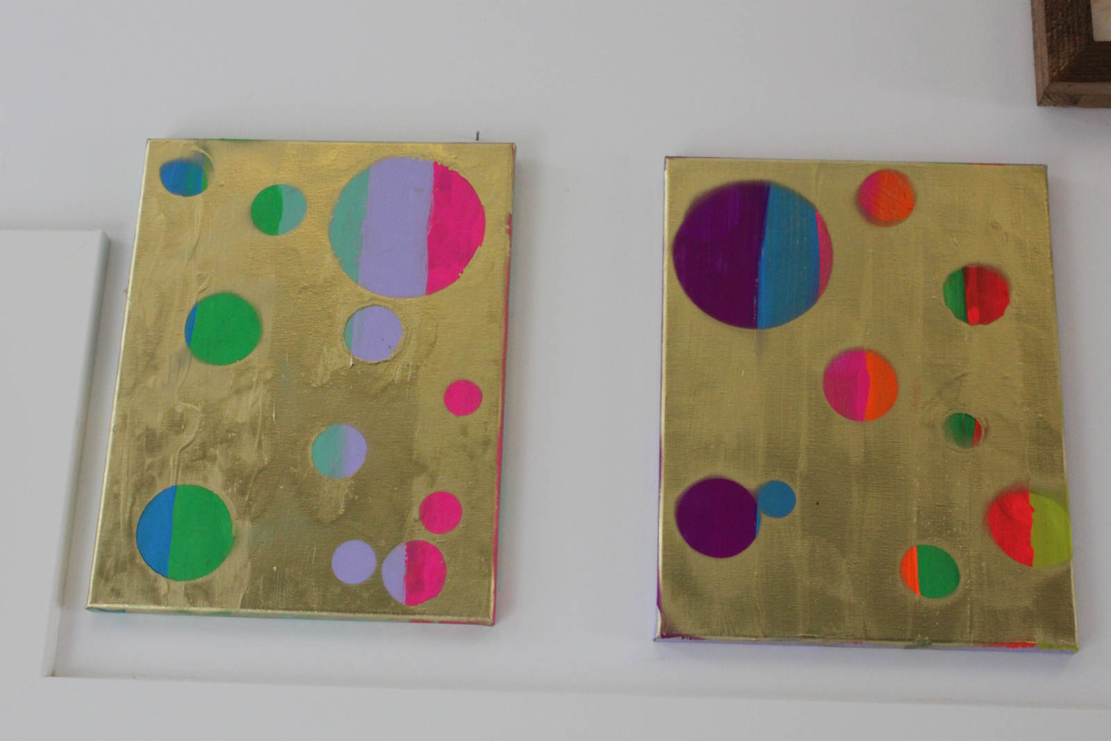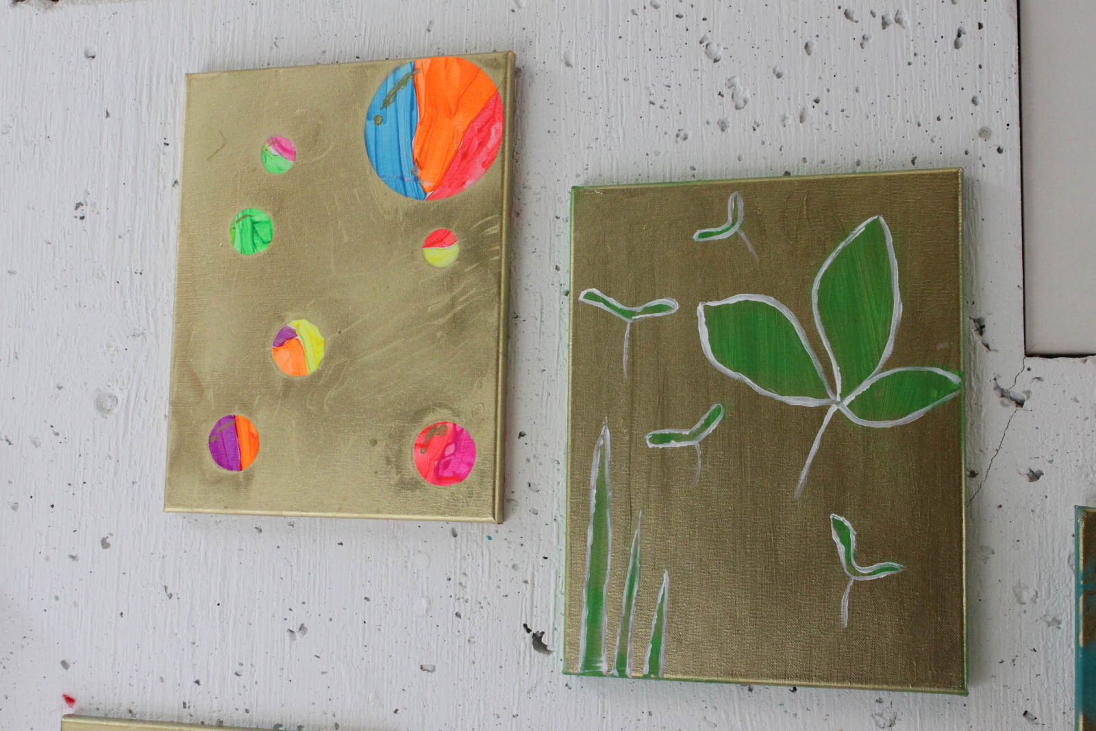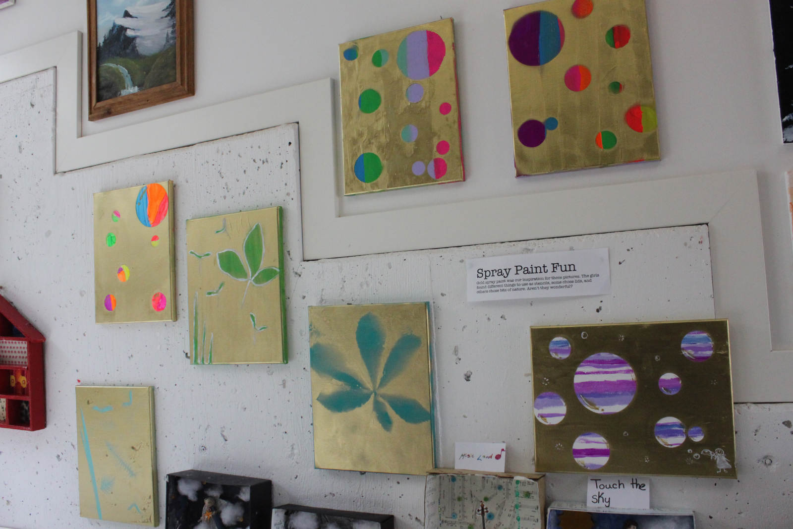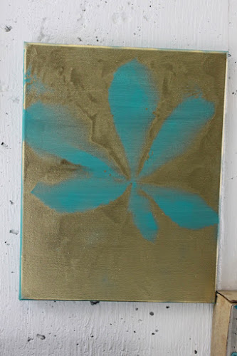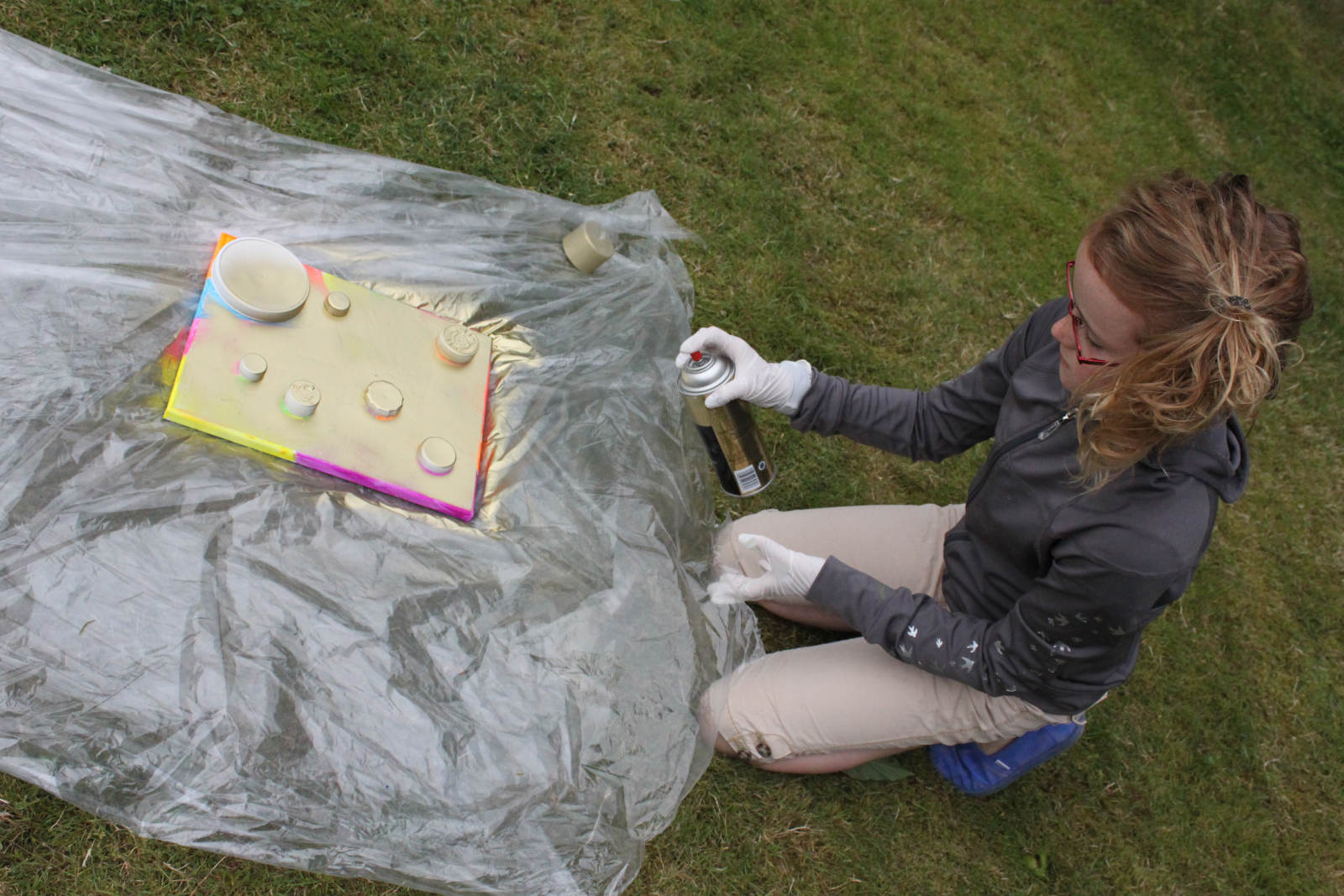 Gold spray paint! The girls found different things to use as stencils, some chose lids, some chose bits of nature. Gold!