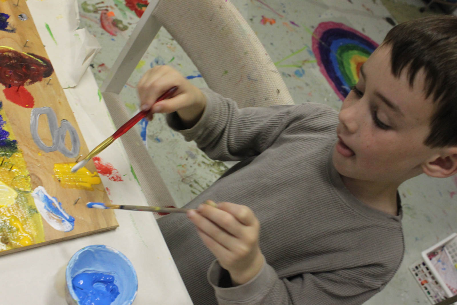 While he worked, I drew his attention to how he was mixing colours, and applying the paint and the effects he was achieving. He even tried to paint with both hands, a paintbrush in each hand, two different colours, mixing and playing together.