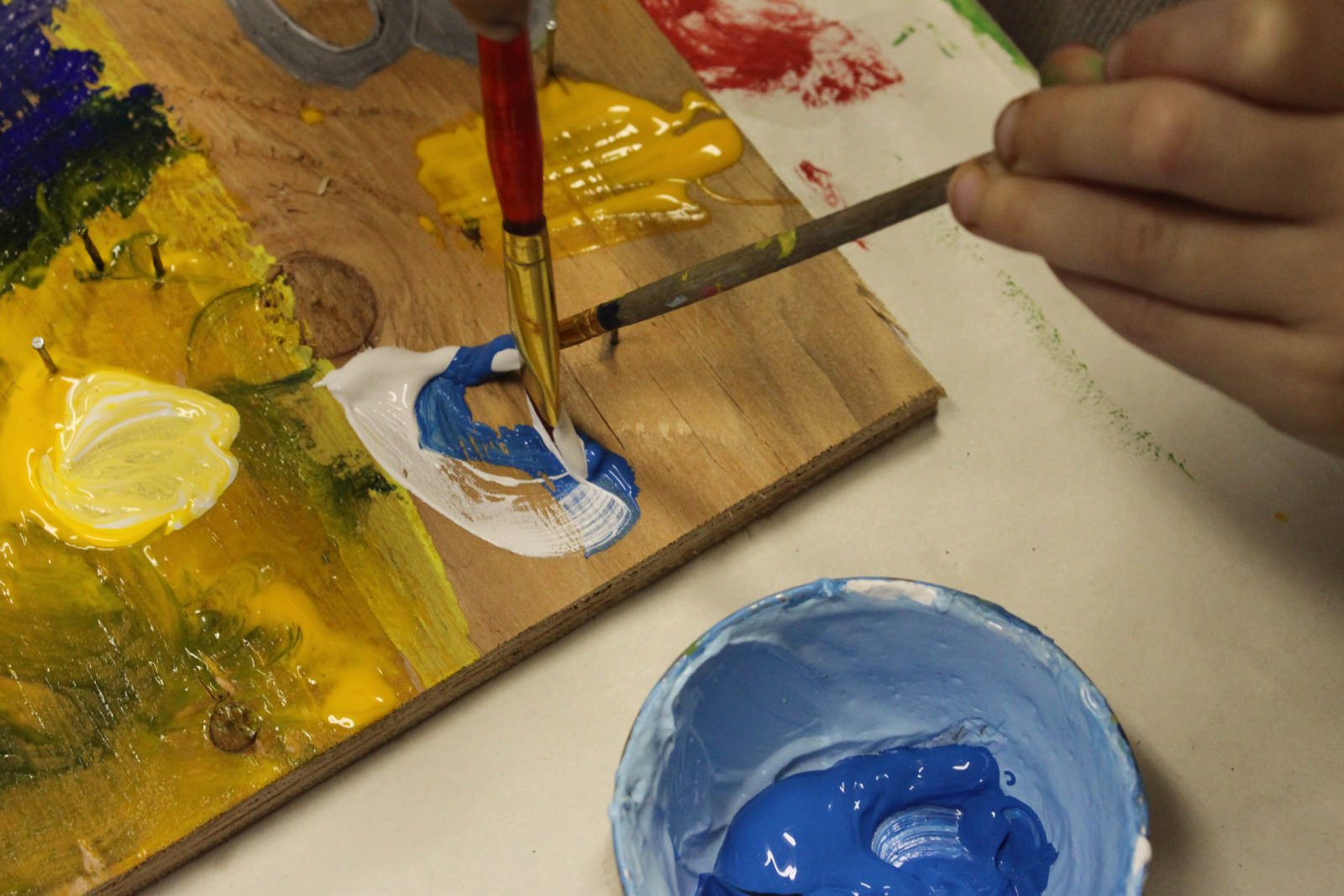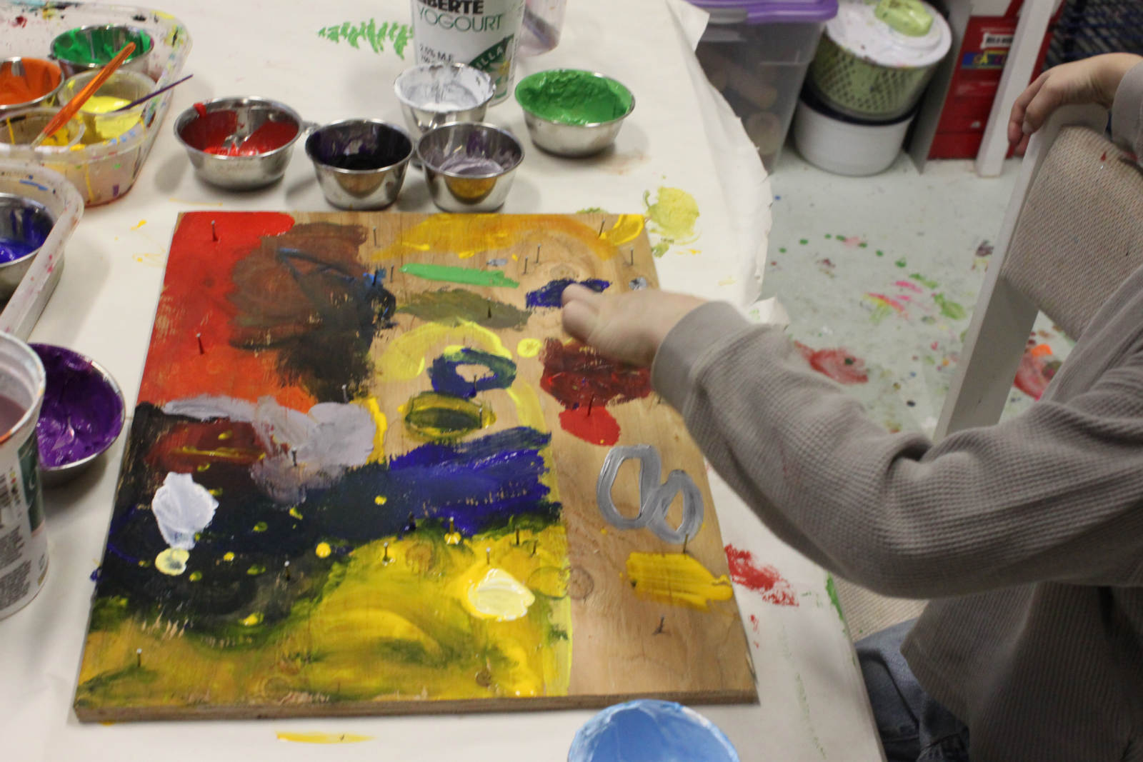 In our next class, Finn took his string art to the next level. We got a nice piece of plywood, and Finn began to hammer nails into it, for the anchors for his string. The hammer was quite heavy, and cumbersome for him to use, so Finn put a pencil mark for each post and I helped him finish off the hammering. The real interesting work came when Finn painted the background. I asked him what colours he wanted to use, and he knew exactly.