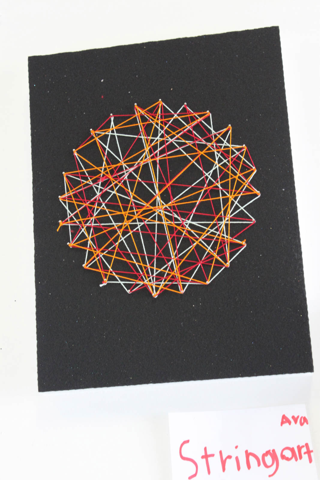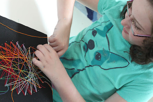 Someone told me that string theory was dead, so I thought we should take a trip back in time to the 1970’s to make these wonderful string art pieces. They turned out so awesome! The studio fell into silent concentration while the stringing was happening, and in the capable hands of young artisits, the strings and pins transformed into retro beauty.