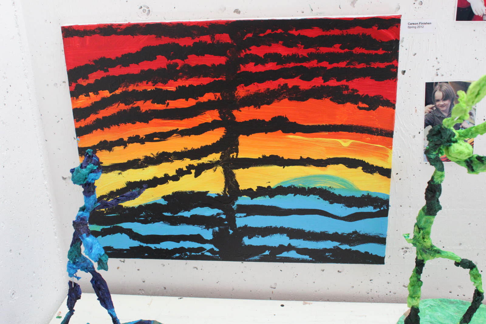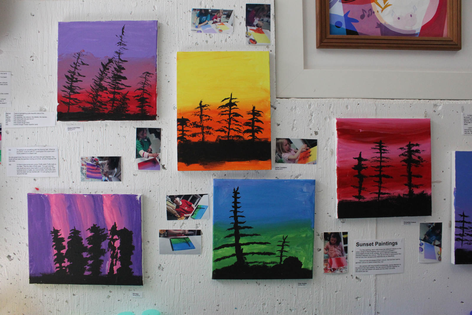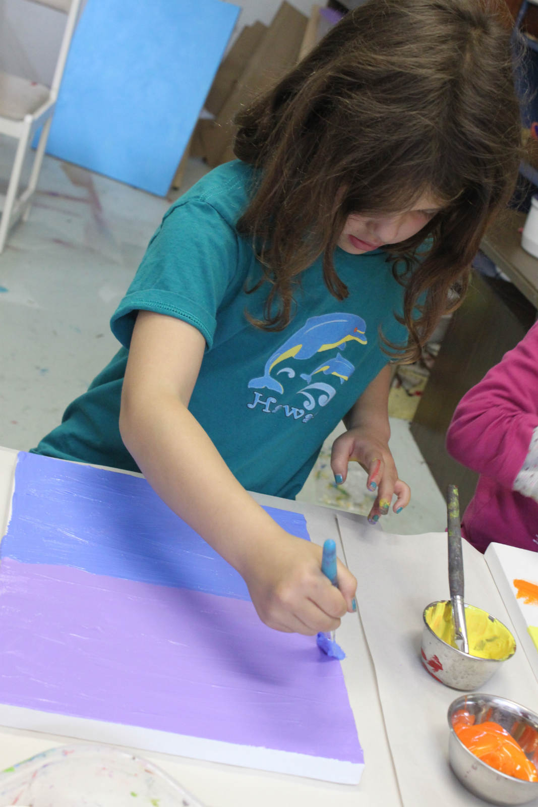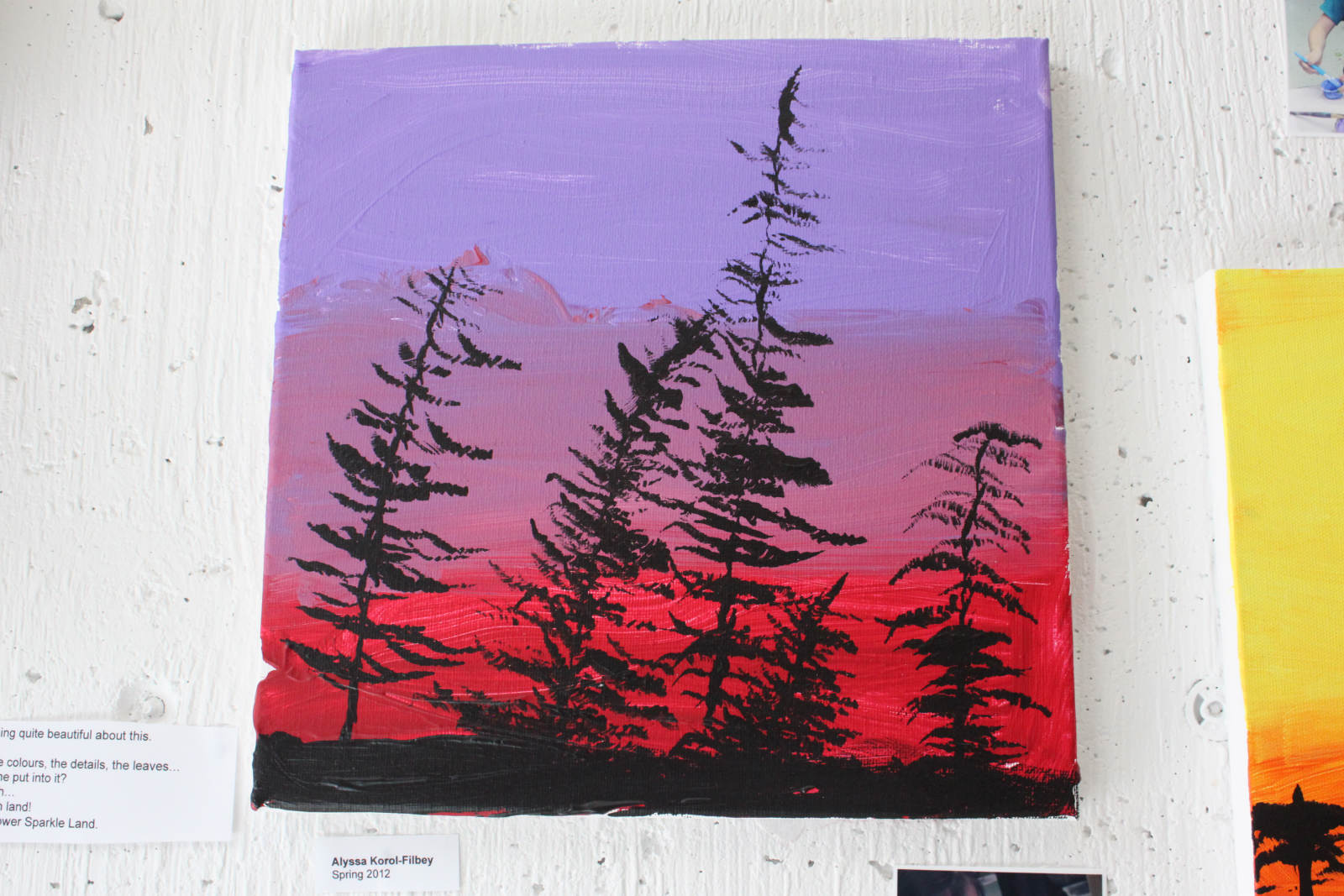 For this painting, each child chose two adjacent colours on the colour wheel to blend together into a continuous gradient. I encouraged smooth brush strokes, and to attempt a seamless transition between the colours. This can be tricky to accomplish! But look at how their backgrounds resemble sky so beautifully.