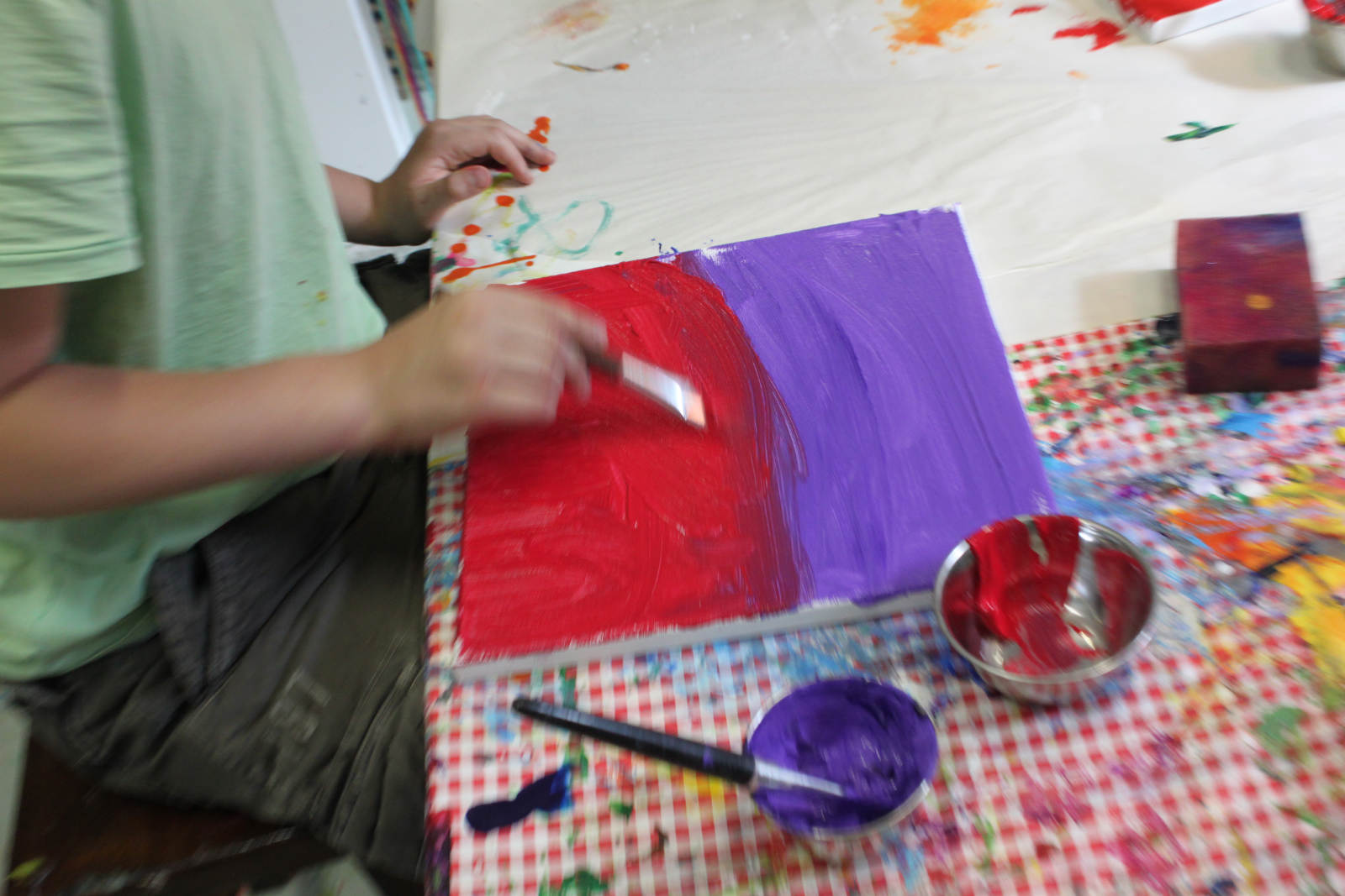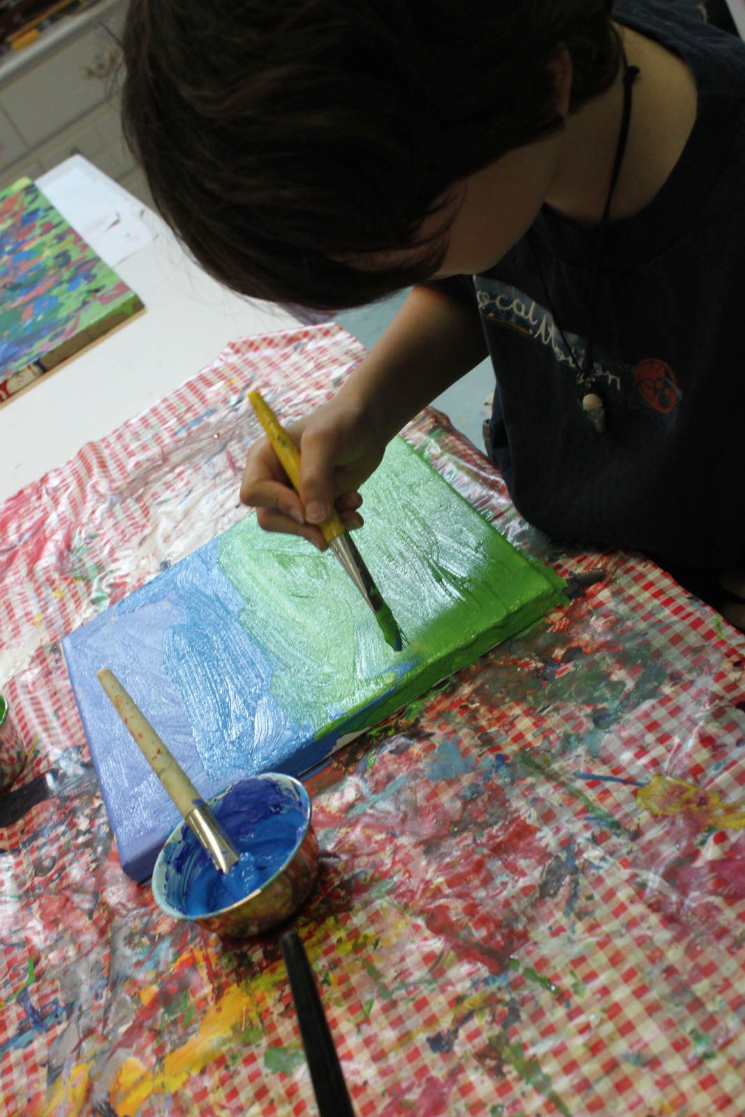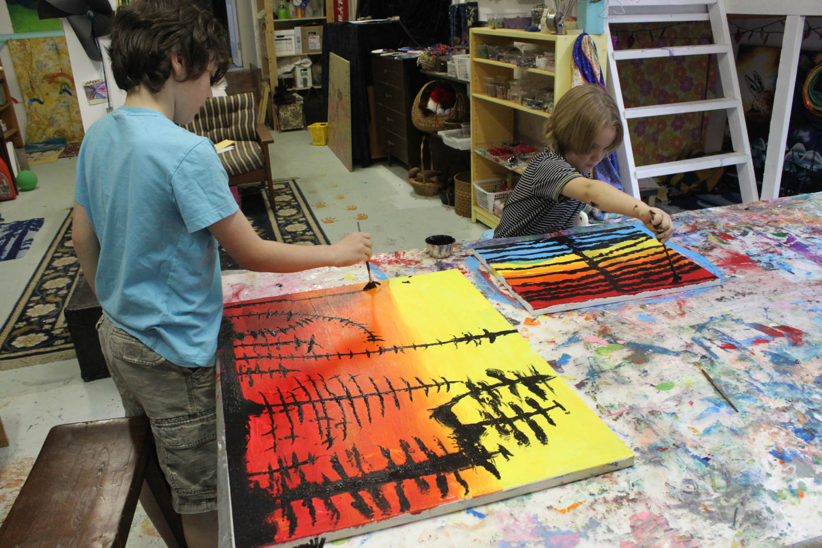 The next class, the boys each attempted to blend some more skies, on larger canvases. The worked together, confidently, and found out that knew exactly what to do.
