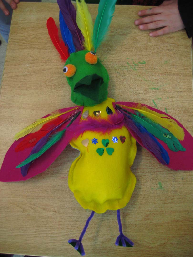I came stocked with felt in a rainbow of colours, feathers, stuffing, and pipe cleaners, and with a few minutes of instructions and inspiration, the children got busy each with a vision and the tools to create their very own wild and wonderful bird. Some birds were inspired by real species, and others by the fantastical depths of imagination. It was great to see children empowered by their ability to create something that they could interact with, and be proud of. I noticed as students were finishing up, that they walked around the room with their birds puppeting them with one another, creating little personalities and voices and names for their new friends.