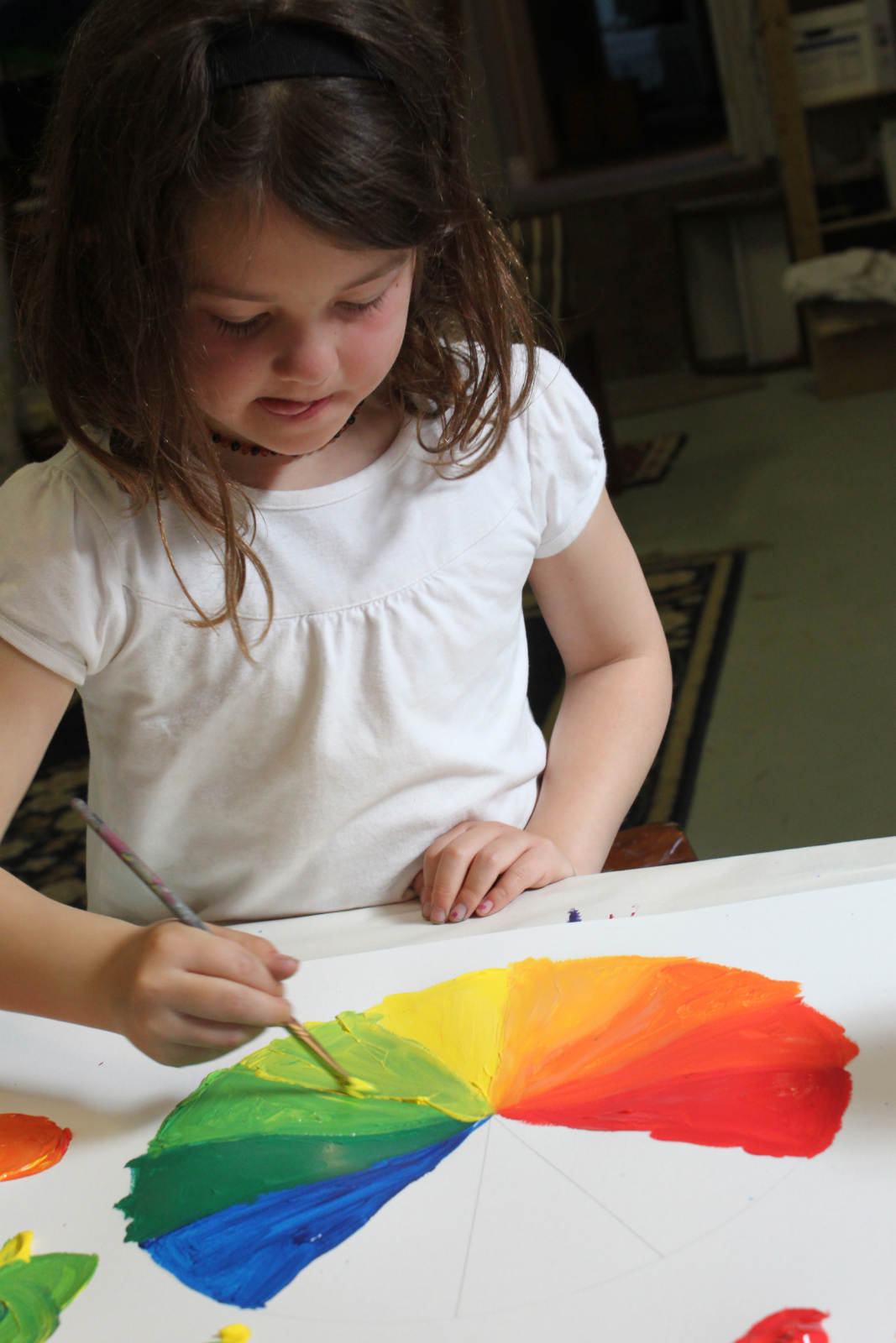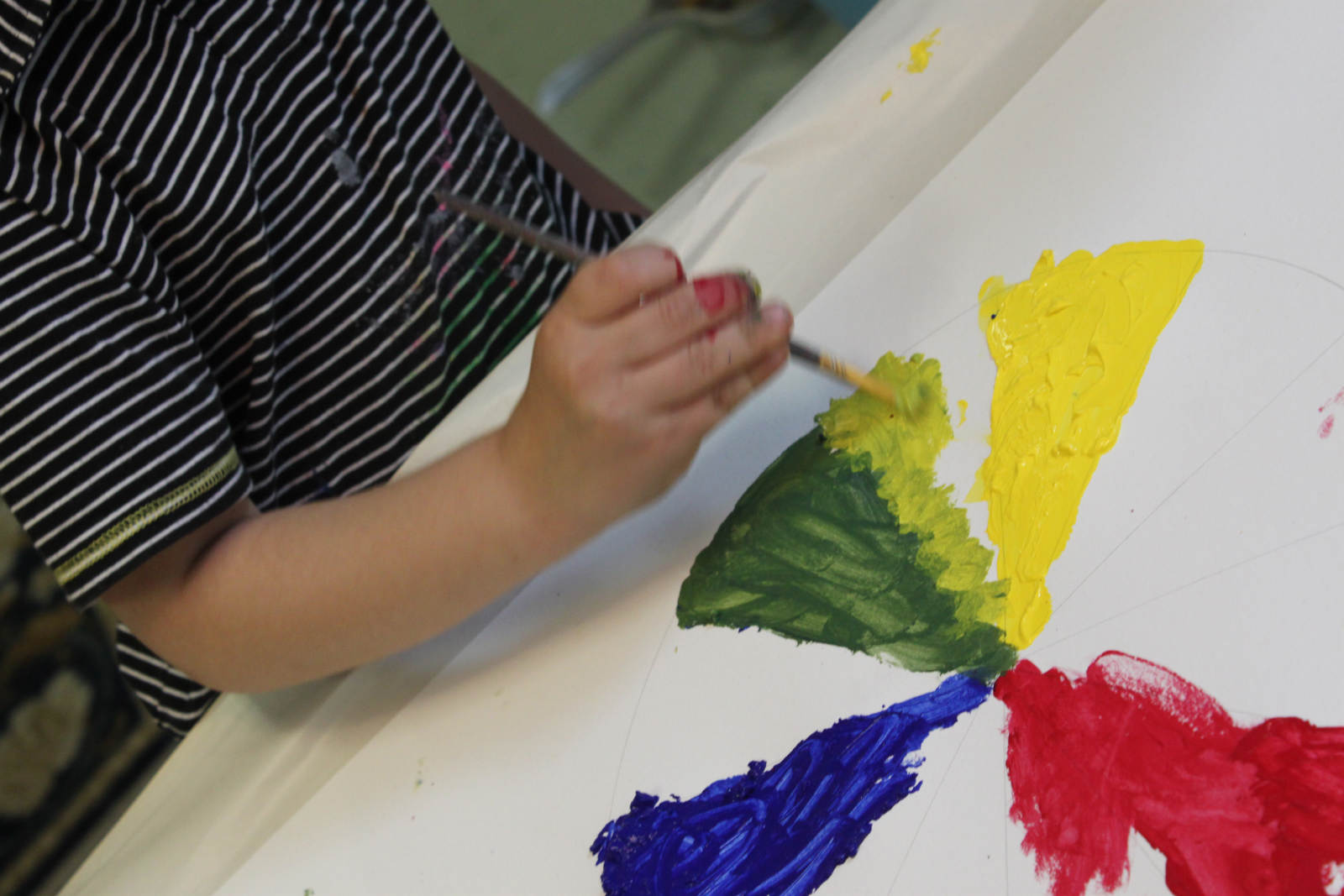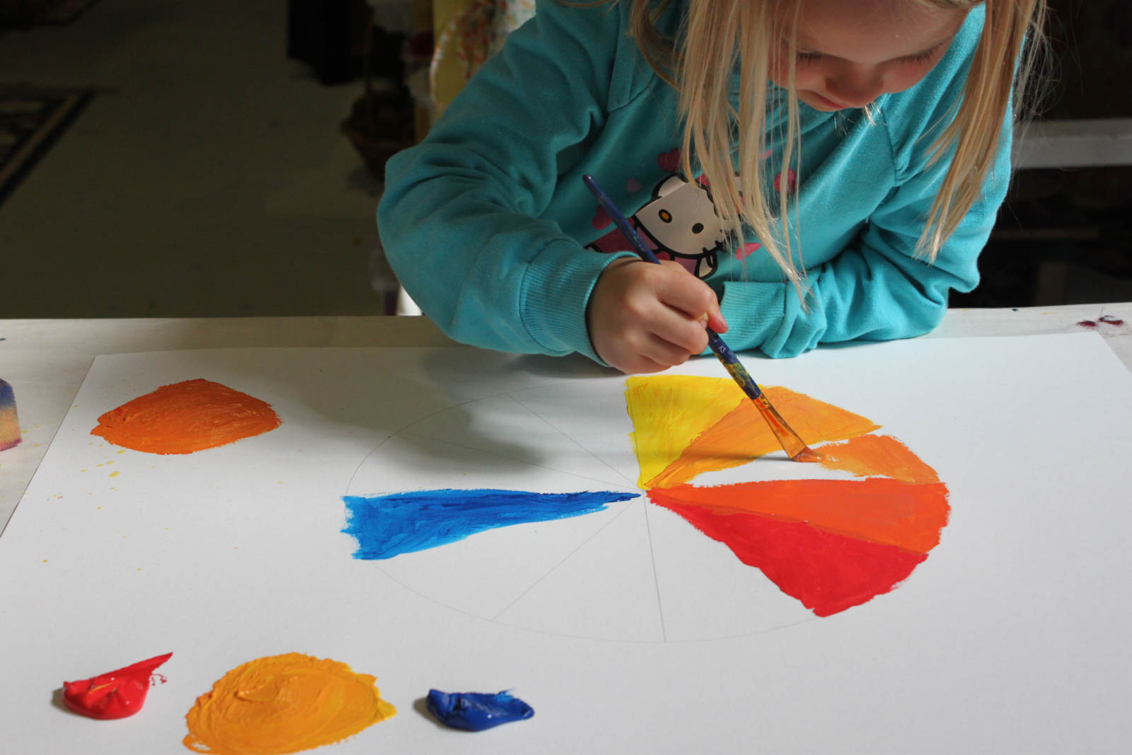 Lainey: First you start off with a dark green, then lighter, and lightest. I’m gong to add a bit more blue. …So the bright one goes nearest to the yellow, or nearer to the blue?