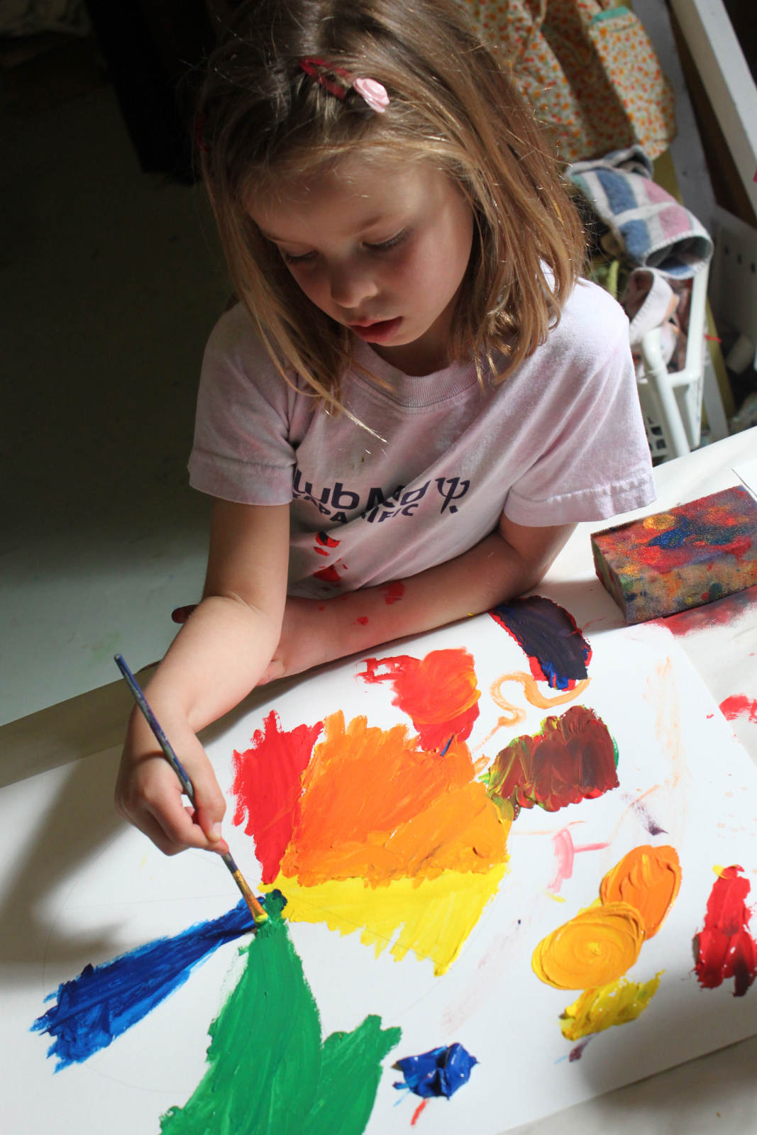 Isla needed more direct instruction to get the desired colours. Left to her own devices, she was inspired to mix all the colours together, just to see what happened. Part of me wanted to let her just mix all the paint together to her hearts content, but part of me also wanted her to learn from this about all the different ways she could mix to get specific colours.