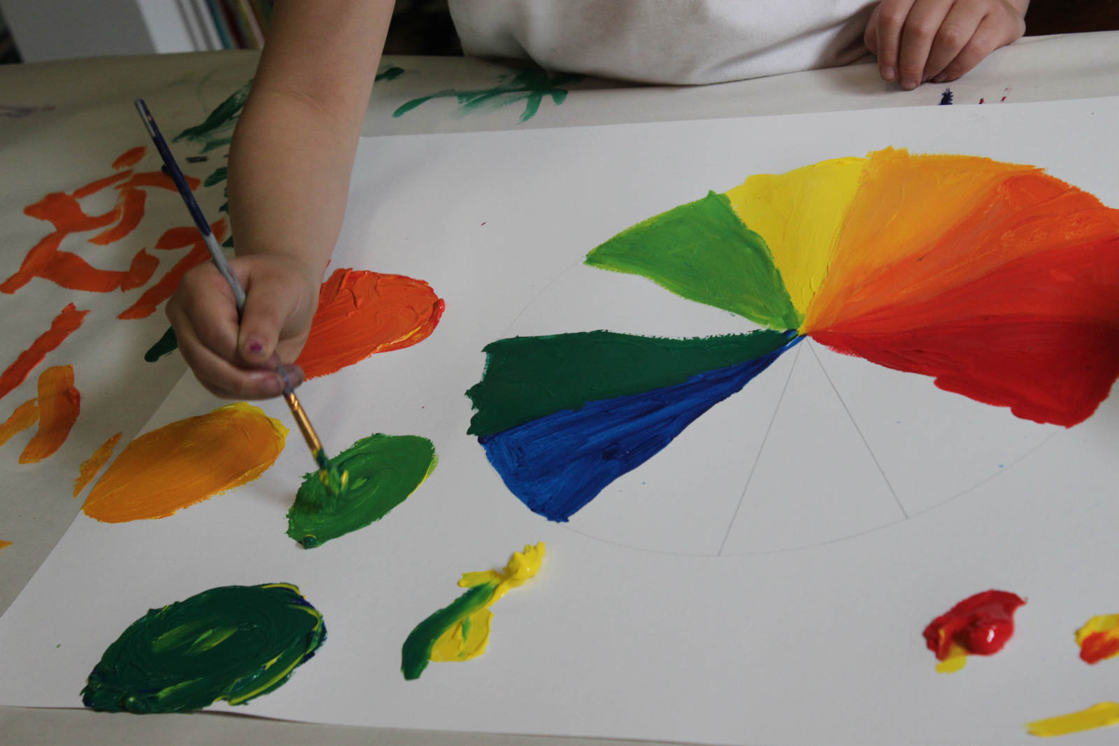 Not only was Carson learning about colour mixing, he was also learning about how to hold a brush, and how to apply paint effectively. At first, Carson wanted a bigger brush than the ones I had out for them, so I gave him one. No sooner did he start, that he realized bigger doesn’t mean better. He found much more success with a smaller, more appropriately sized brush.