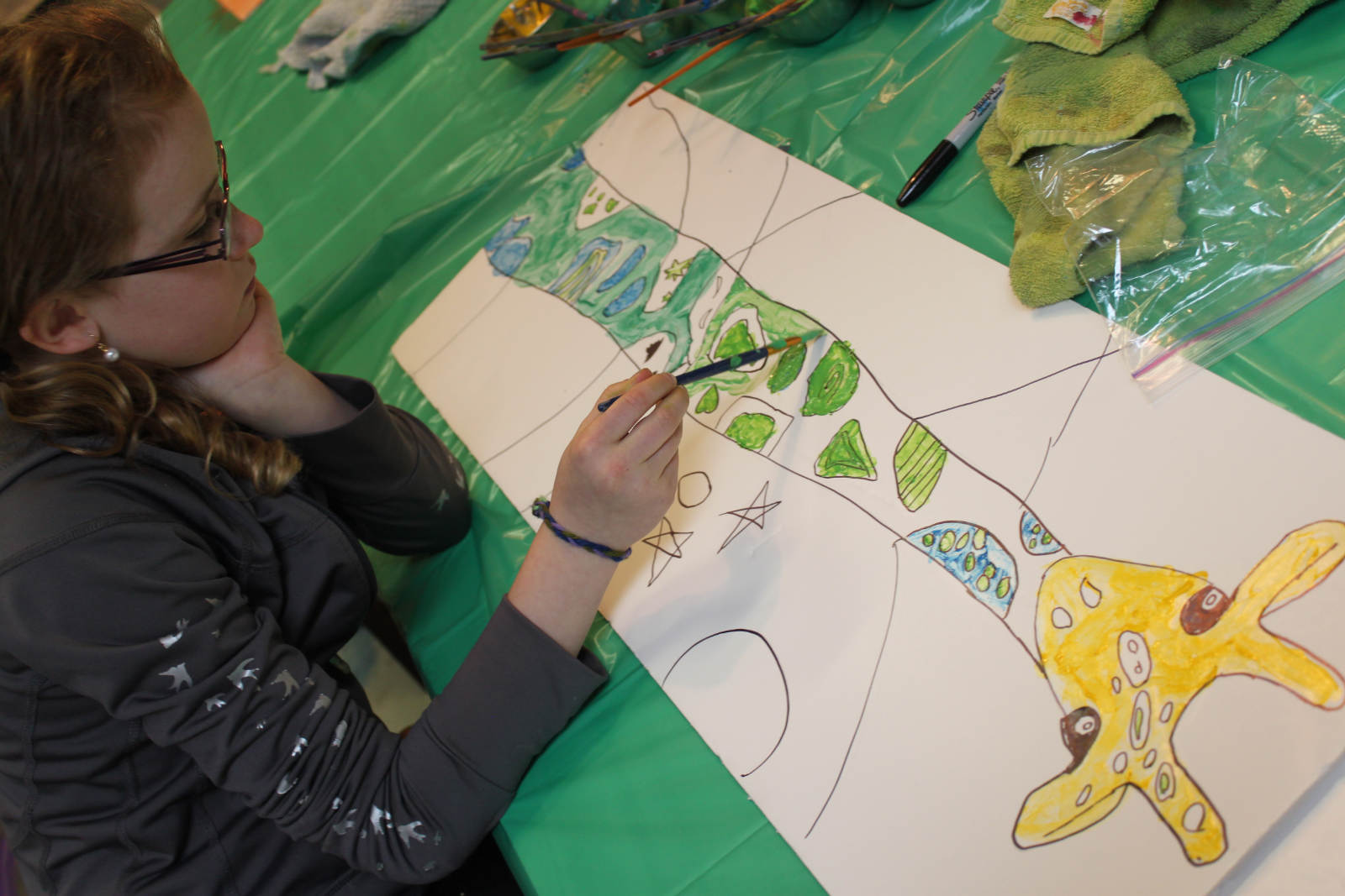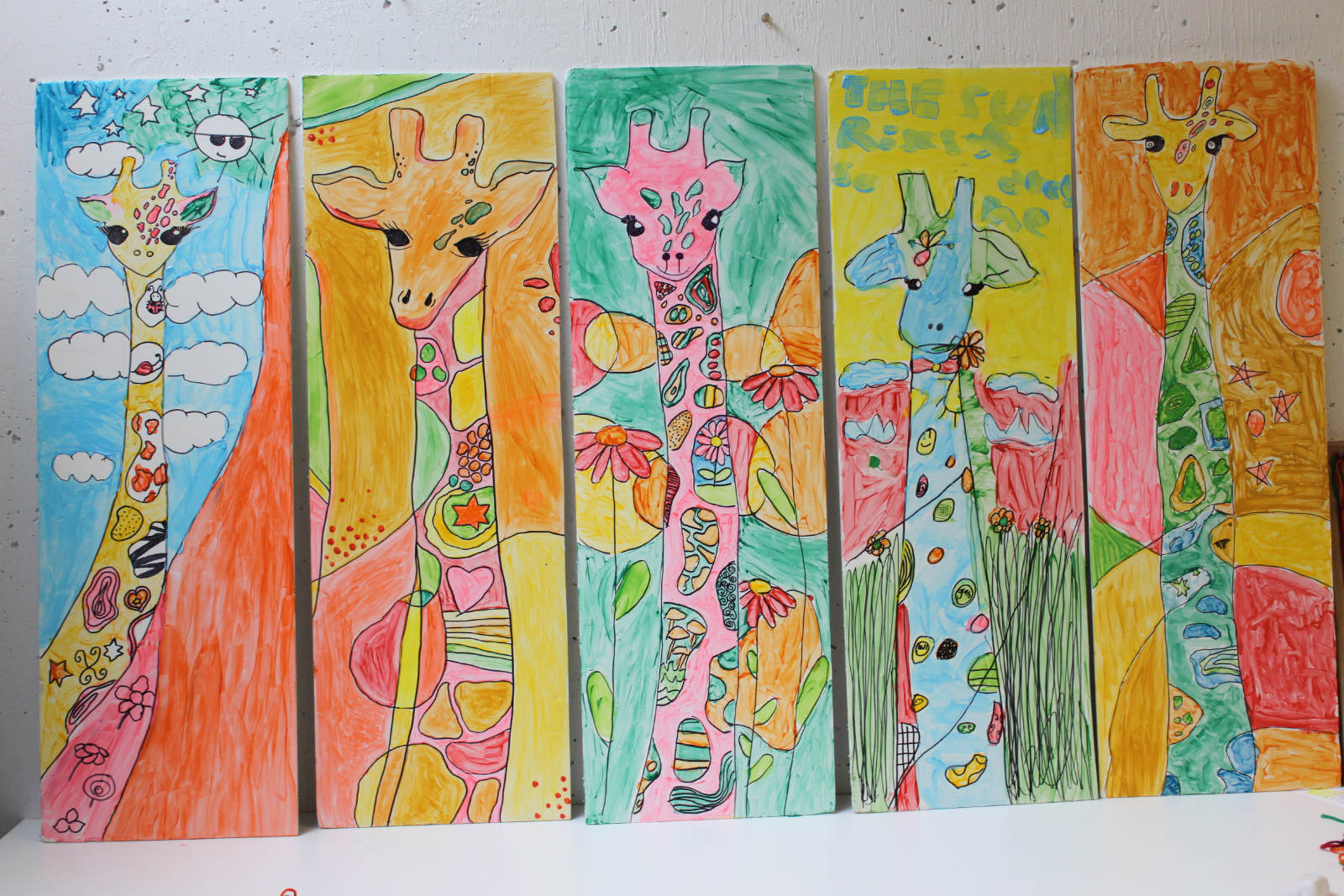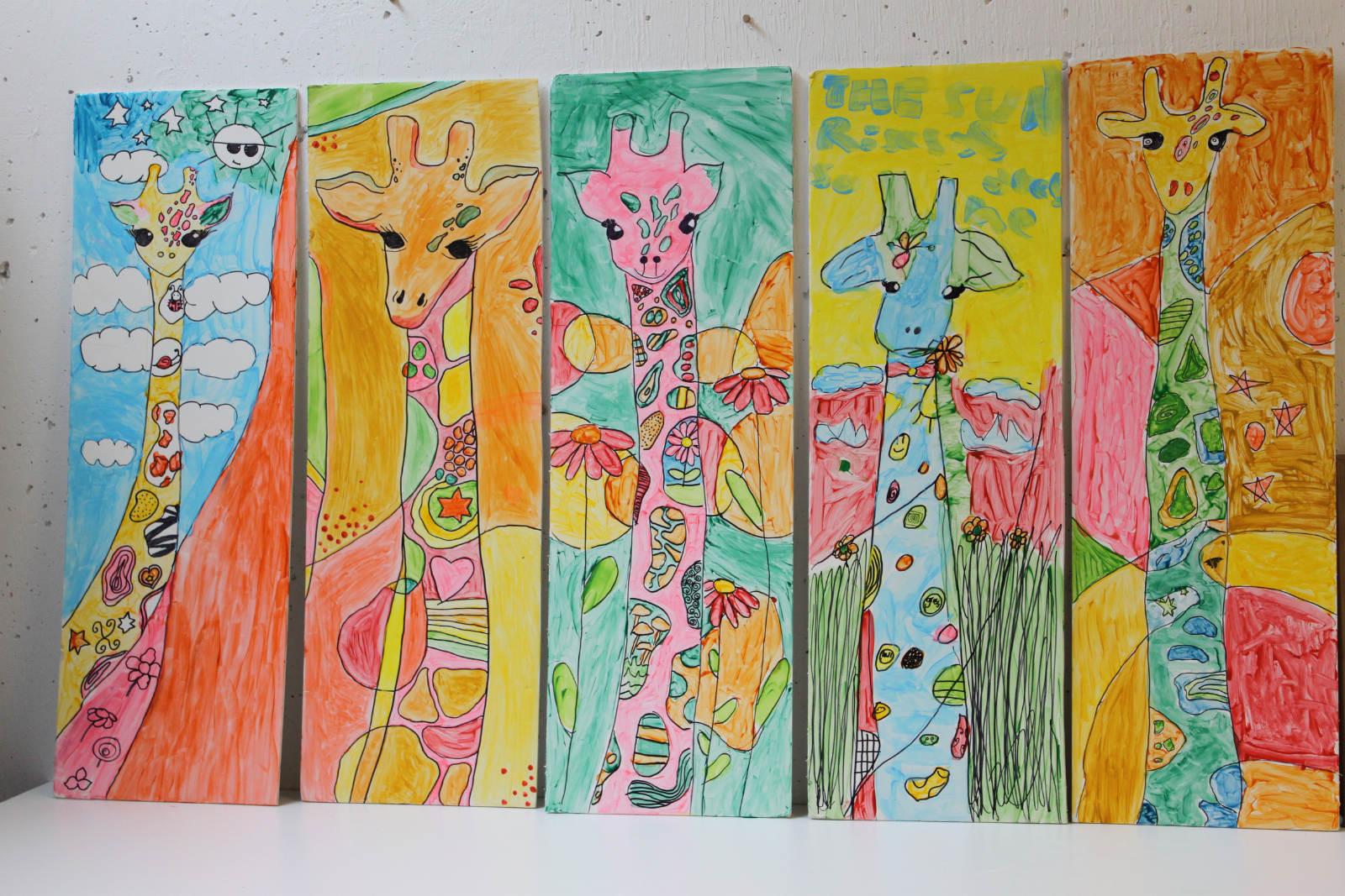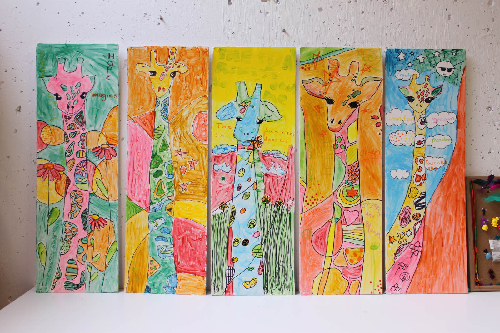 We were inspired by a piece of art we had seen, and used it as a jumping off point for our own long neck giraffe pictures. I had the perfect boards to use for the canvas, and we mixed small amounts of colour in with gloss medium, and used that for our paint. Now THESE are whimsical giraffes. The girls even added inspiring words and phrases the next day with oil pastels.
